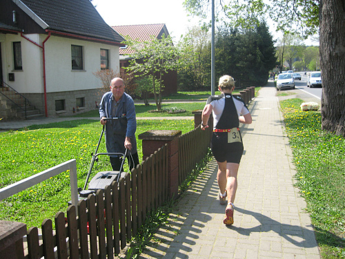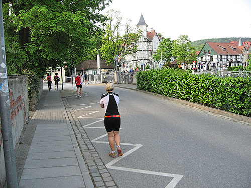 Wir überholen einen Läufers und kommen ins Gespräch. „Wart ihr schon mal druff?“ fragt er. Ja, bei diesem Lauf ist es wohl wie bei dem Rennsteiglauf, da ist man wohl druff auf dem Weg, Berg, oder was auch immer. Zumindest warn mer gut druff, wie wir Hessen sagen, auch wenn die Muskeln, Knochen und Gelenke ständig ein Wörtchen mitreden wollen.