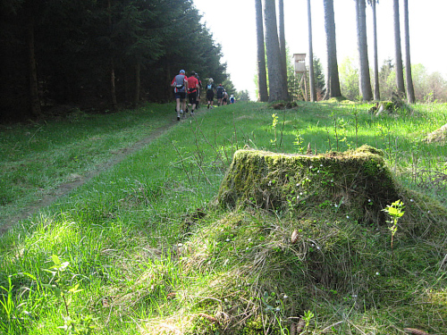 Längere Zeit bergauf zu laufen ist sehr anstrengend – körperlich und mental. Man läuft nicht gegen die Anderen sondern nur gegen den Berg. Bei Kilometer 39 haben wir den höchsten Punkt der Strecke erreicht, den Poppenberg, 600,8 m hoch. Für uns nicht hoch genug, denn den 1894 errichteten 33,5 Meter hohen Aussichtsturm besteigen wir auch noch. Die zusätzlich Mühe lohnt sich. Bei dem herrlichen Wetter heute ist die Sicht fantastisch und reicht bis zum Thüringer Wald. Vor diesem Aussichtsturm gibt es eine weitere Verpflegungsstation. Von oben sehen wir viele Läufer beobachten die wir irgendwann mal überholt hatten. Lange hielt es uns aber nicht dort oben, denn dort pfiff ein kalter Wind, für ein Foto war aber noch Zeit.