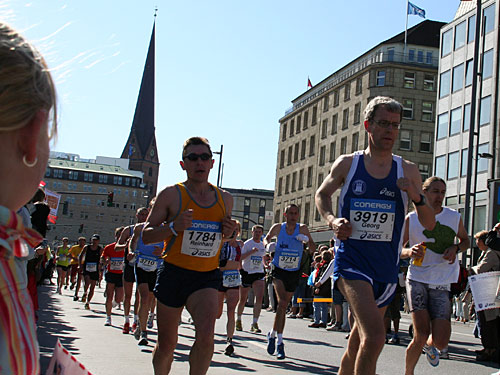 Mit meinen Zeiten bin ich vorerst sehr zufrieden. 24:57 min für die ersten 5 km, 24:47 für die zweiten, so kann’s bleiben. Weiter führt uns die Strecke um die Altstadt zur Binnenalster. Hier zeigt sich mir Dörfler Hamburg wirklich als Weltstadt, ich bin sehr beeindruckt. Aber ehrlich auch froh, als ich am Dienstag wieder in meinem Heimatdorf eintreffe. Wenn ich so sehe, daß die meisten Läufer ständig um die Außenalster rennen (müssen), ist die Auswahl an landschaftlich attraktiven Strecken bei uns zwischen Westerwald und Siebengebirge unvergleichlich größer. Aber ich bin ja extra zum Stadtmarathon angereist und genieße diesen (noch).