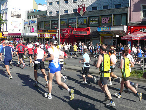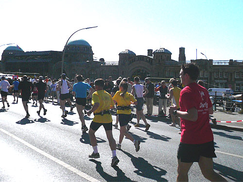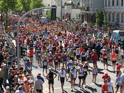 Vor mir laufen Zwei im Trikot der Universität der Bundeswehr München. Hier habe ich zwischen 1980 und 1984 studiert und schnell entwickelt sich ein nettes Gespräch. Die Beiden haben dort 19 Jahre später begonnen und mir wird mal wieder schmerzlich bewußt, was für ein alter Sack ich mittlerweile geworden bin! Richtig der Bär los ist an den Landungsbrücken, die wir dann passieren. Überhaupt ist das Zuschauerinteresse groß, wenn auch nicht durchgehend an der Strecke. 700.000 sollen es insgesamt gewesen sein.
