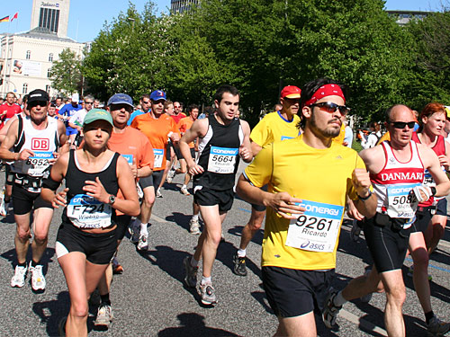 Die Startaufstellung erfolgt in bewährter Manier auf drei Straßen (Karolinenstraße, Holsteinglacis/Bei den Kirchhöfen und Gorch-Fock-Wall [West und Ost]). In 4 Wellen und jeweils fünfminütigem Abstand werden die Läuferinnen und Läufer zwischen 09.00 und 09.15 Uhr auf die Piste geschickt. Auf der Glacischaussee sind dann alle nach wenigen hundert Metern vereint. Aufgrund des gestaffelten Starts entsteht kein nennenswerter Stau und ein relativ freies Laufen ist bald möglich. Klar, man muß hier sicherlich Zugeständnisse machen: bei fast 18.000 Teilnehmern (23.000 waren gemeldet) kann man nicht den gleichen Platz erwarten wie bei nur wenigen hundert.