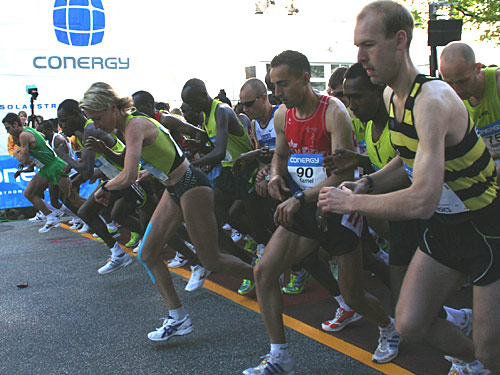 Am Sonntag muß ich leider zusehen, wie sich mein Anhang und mobiler Fanblock beim Frühstück (ab 05.30 Uhr!) die Bäuche mit den leckersten Dingen vollschlägt, während der asketische Athlet sich mit zwei Honigbrötchen (ohne Butter) begnügt. Derart gestärkt machen wir uns zum Startgelände auf, an dem schon munteres Treiben herrscht. Wie immer kann man alle Schattierungen von Läufern beobachten: die ruhigen, in sich gekehrten, die hypernervösen, die alle paar Minuten die Dixis frequentieren oder sich schon frühzeitig aufwärmen. Es gibt jede Menge zu beobachten, es wird nicht langweilig.