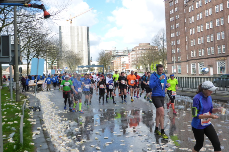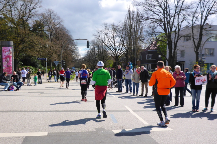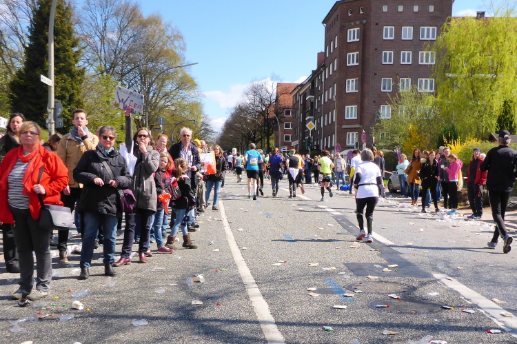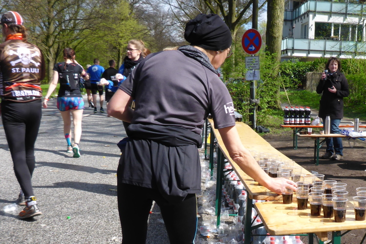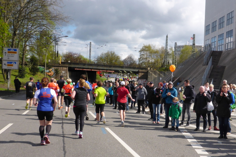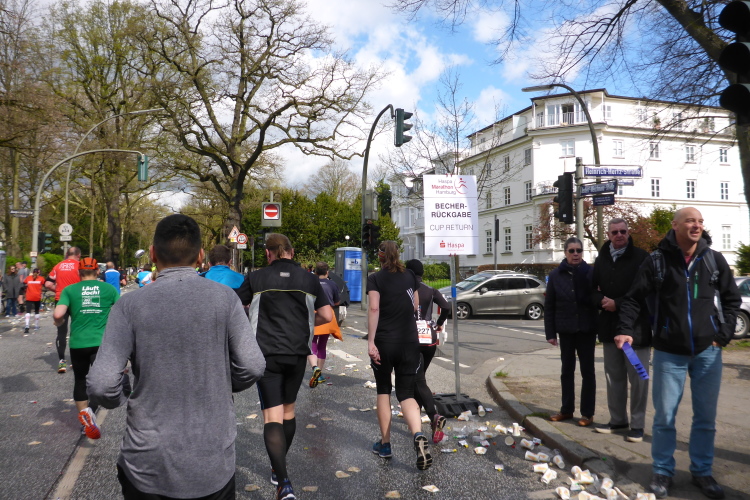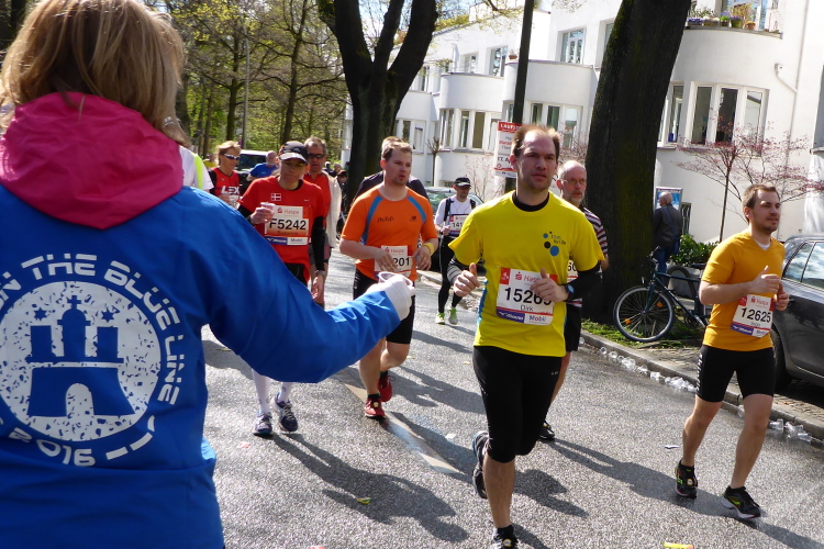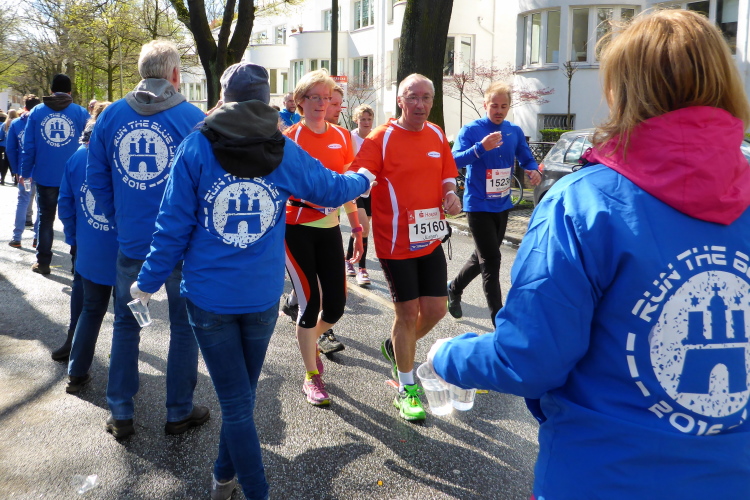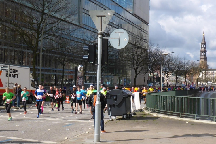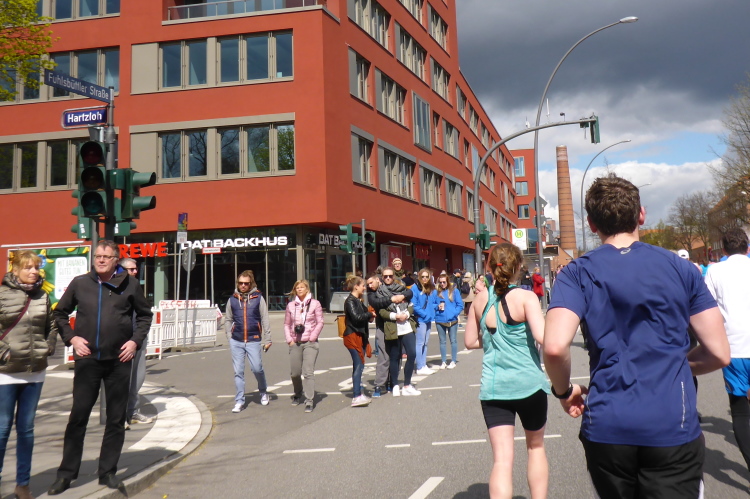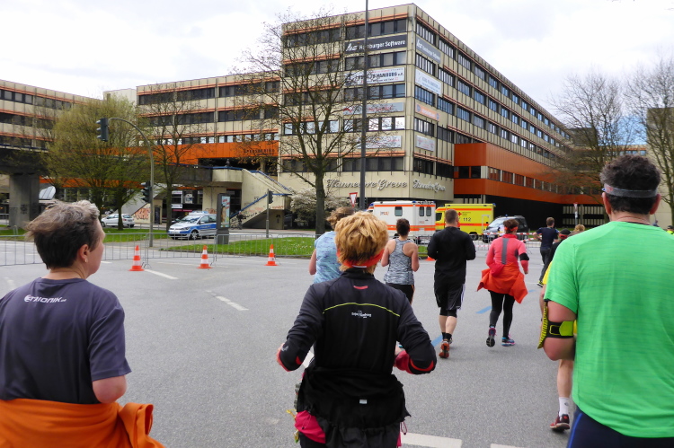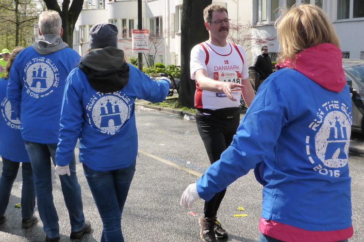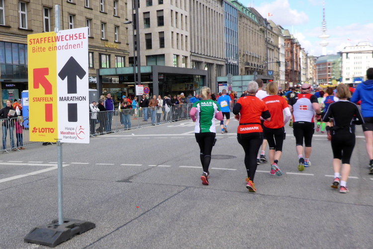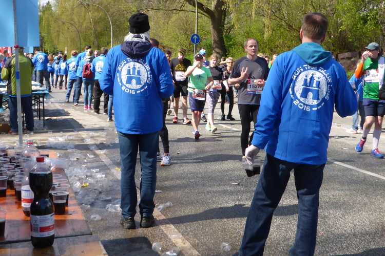 Am Überseering (km 28), einer Straße im Hamburger Stadtteil Winterhude, die wie ein Rundbogen verläuft, ist die nächste Wechselzone und wieder ein NDR Hotspot. Das Fernsehen überträgt live und es ist immer noch ziemlich viel los. Die Helfer haben sich warm eingepackt, denn auf der freien Fläche stehen sie ungeschützt im Wind.