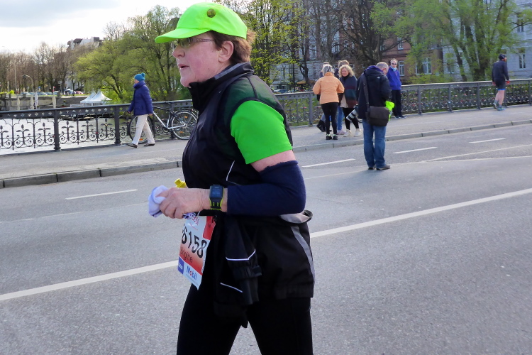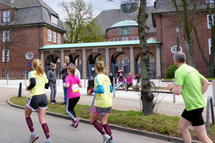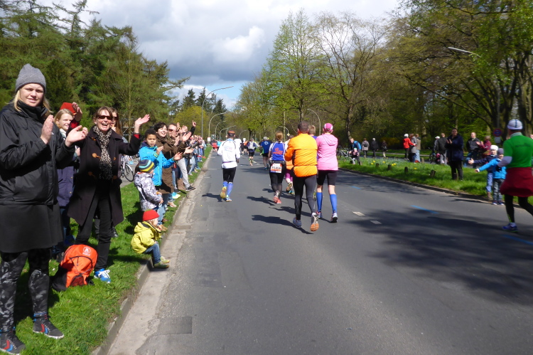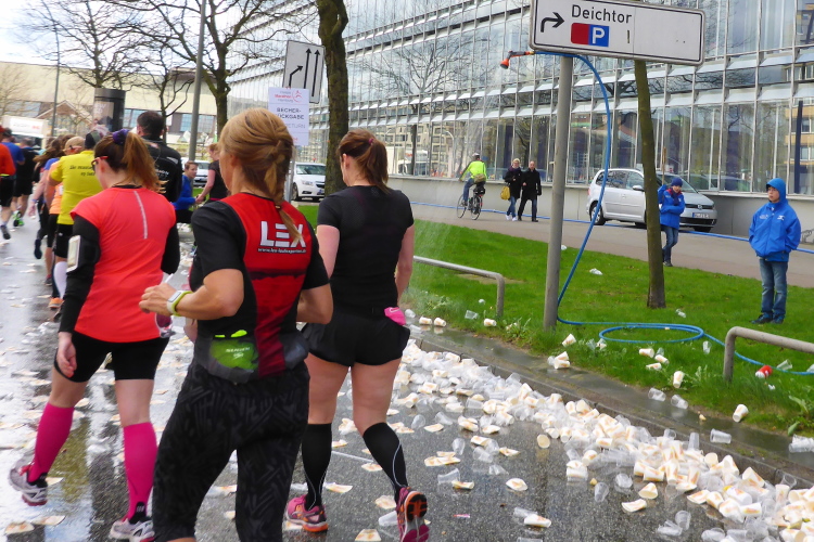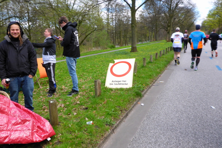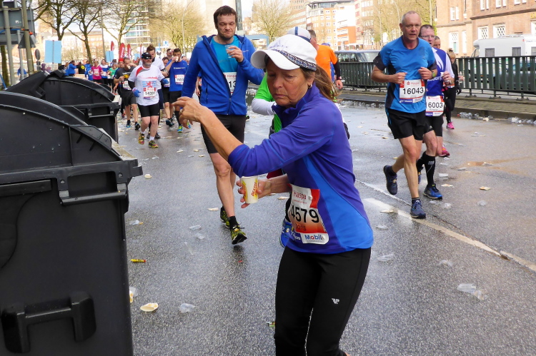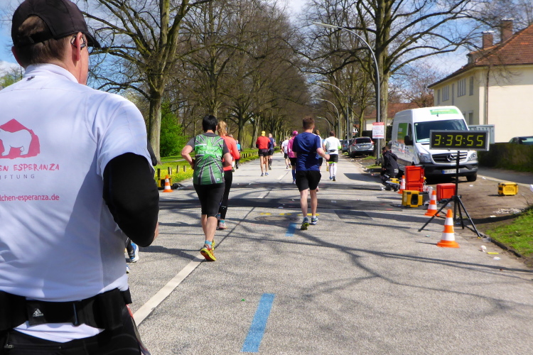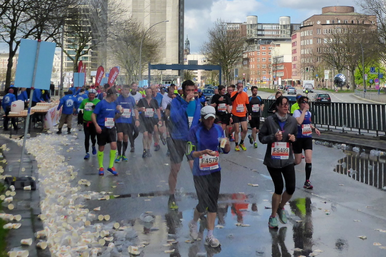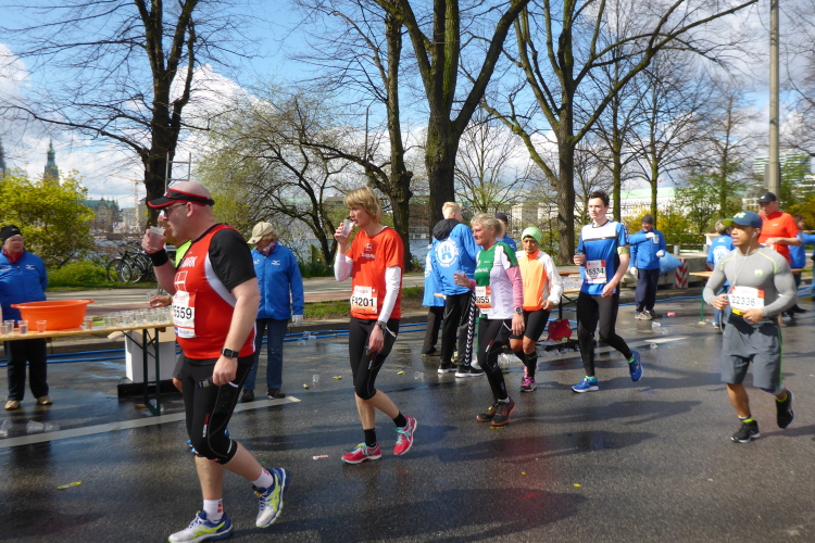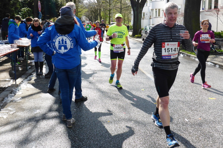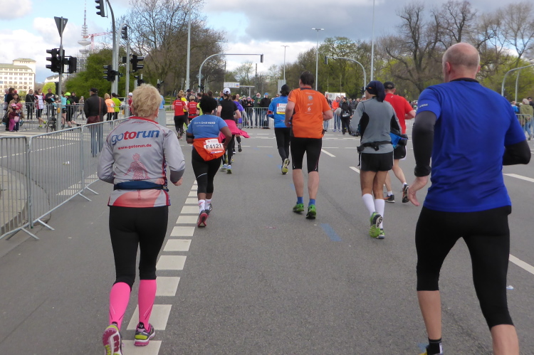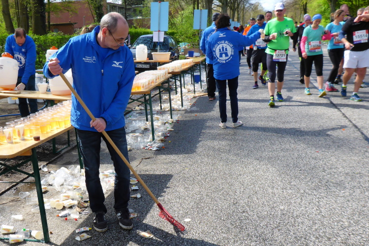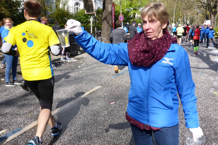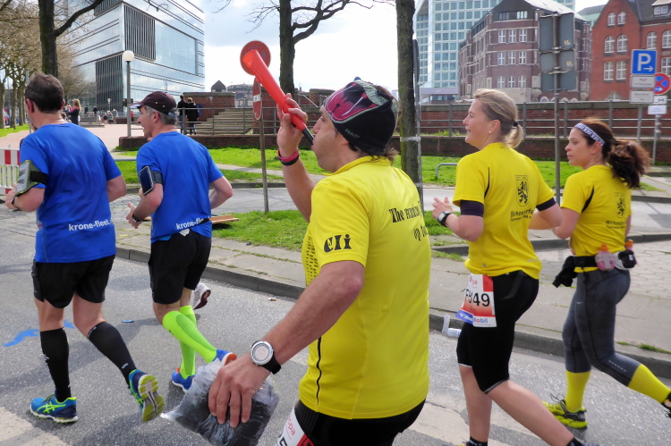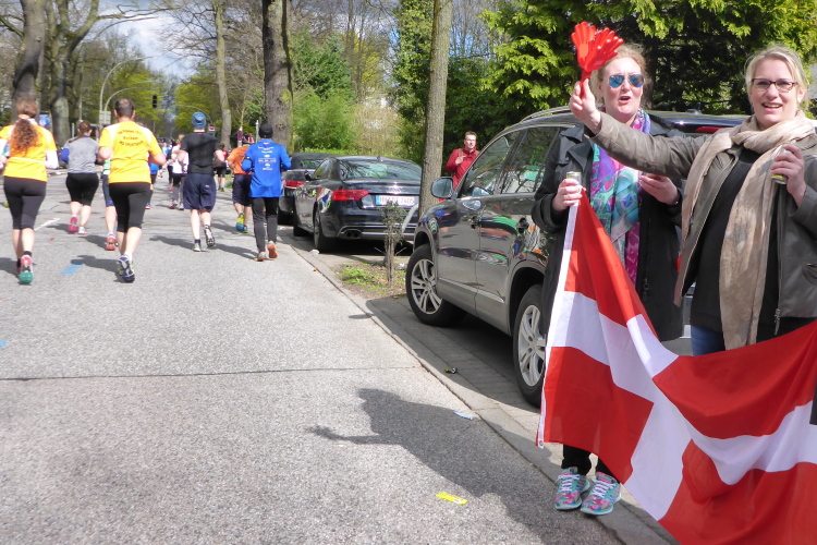 Am Überseering (km 28), einer Straße im Hamburger Stadtteil Winterhude, die wie ein Rundbogen verläuft, ist die nächste Wechselzone und wieder ein NDR Hotspot. Das Fernsehen überträgt live und es ist immer noch ziemlich viel los. Die Helfer haben sich warm eingepackt, denn auf der freien Fläche stehen sie ungeschützt im Wind.