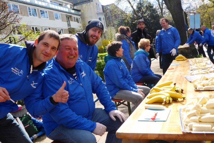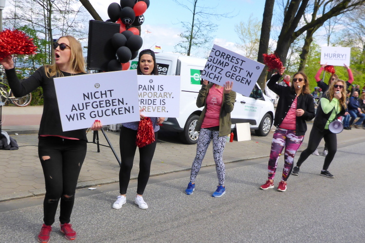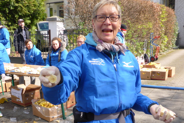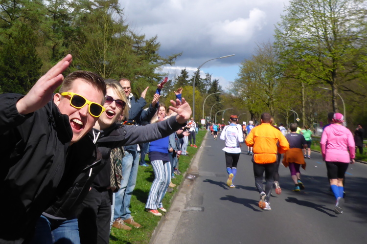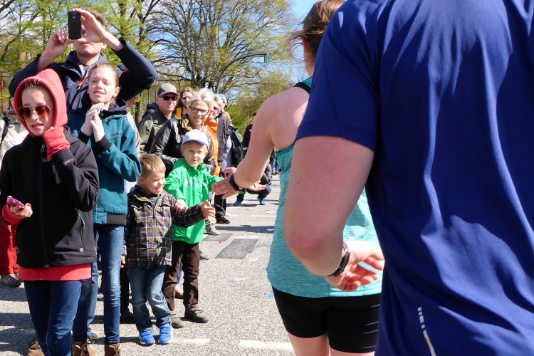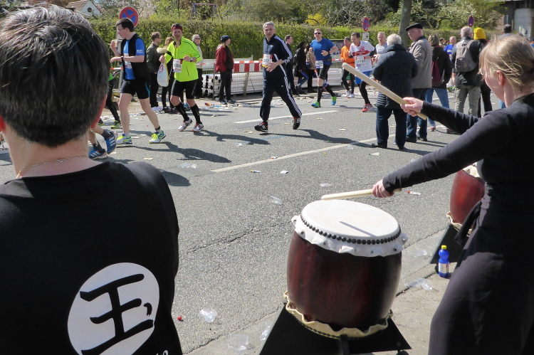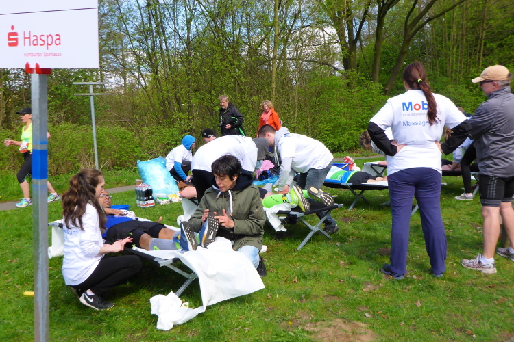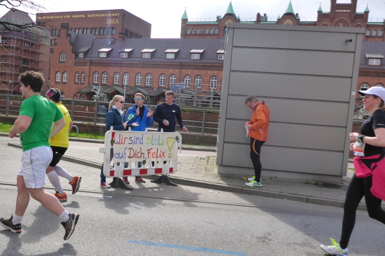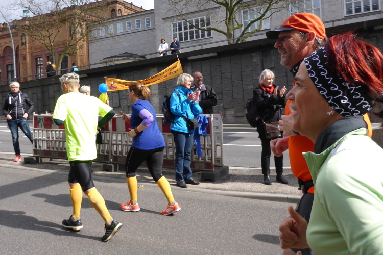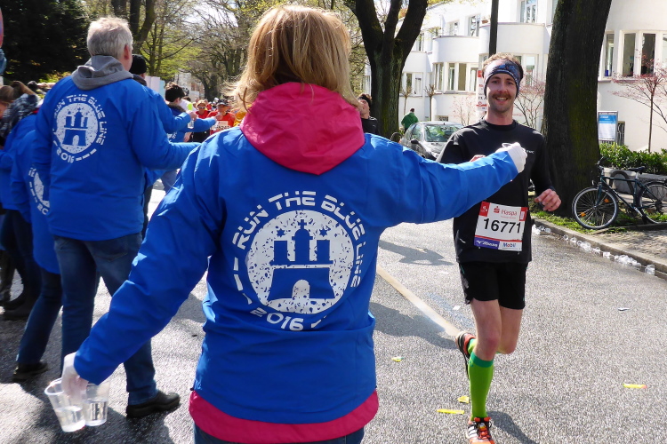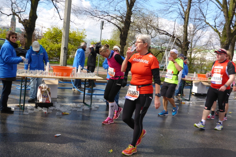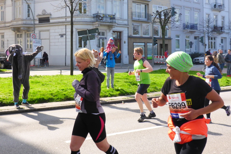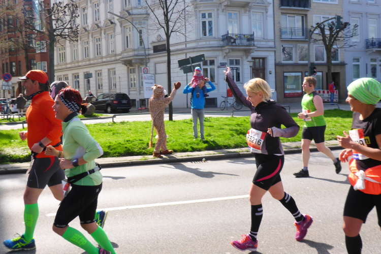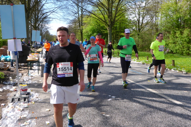 Am Überseering (km 28), einer Straße im Hamburger Stadtteil Winterhude, die wie ein Rundbogen verläuft, ist die nächste Wechselzone und wieder ein NDR Hotspot. Das Fernsehen überträgt live und es ist immer noch ziemlich viel los. Die Helfer haben sich warm eingepackt, denn auf der freien Fläche stehen sie ungeschützt im Wind.