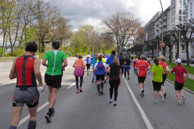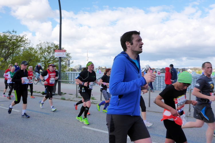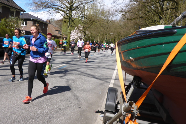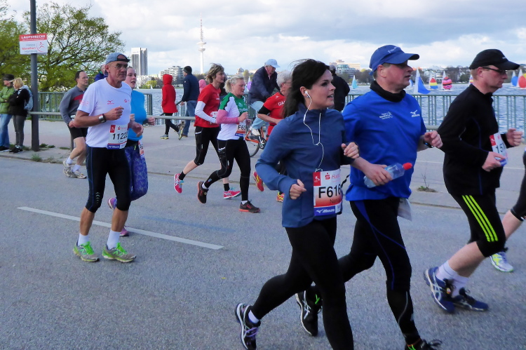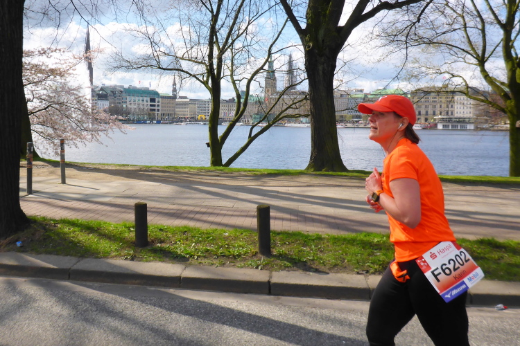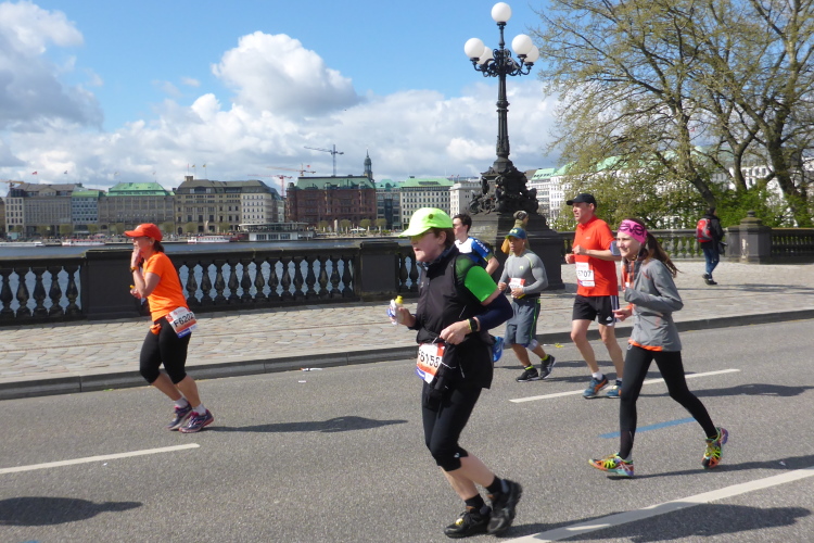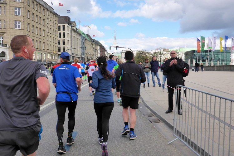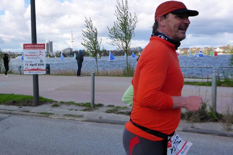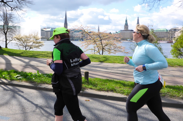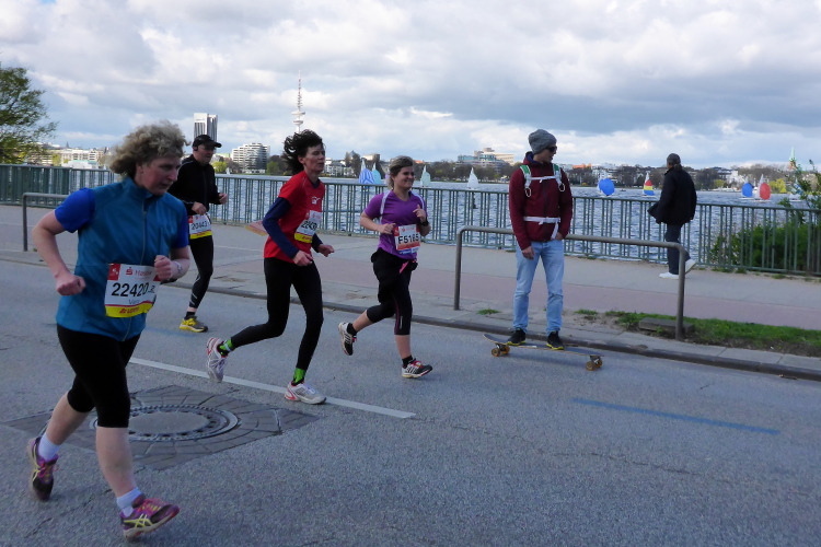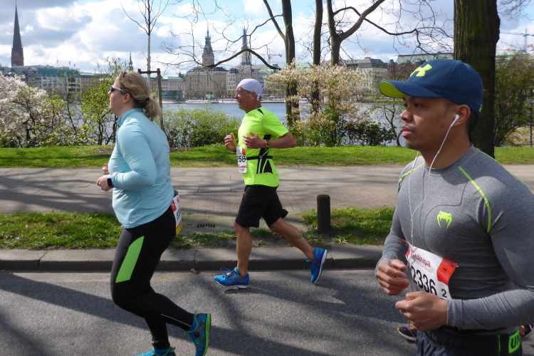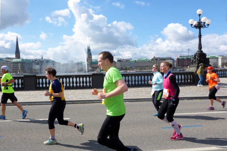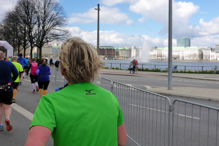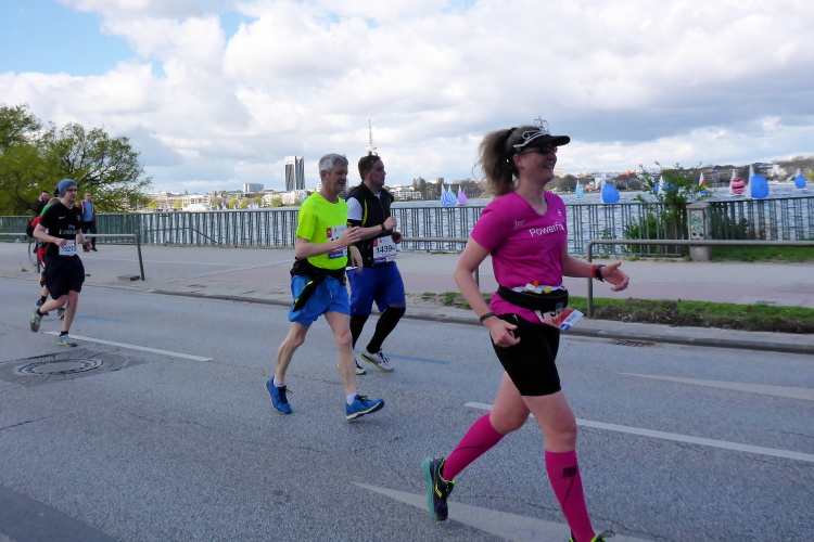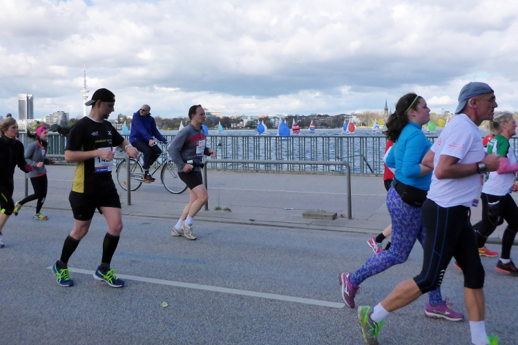 Es geht am Ufer der Außenalster entlang. Der größere, nördliche Teil des Alstersees ist circa 164 Hektar groß und bis zu 4,5 Meter tief. Nach den Highlights der ersten 20 Kilometer wird es nun ruhiger. Hier gibt es nicht mehr so viele Schaulustige, die den Läufern zujubeln. Dafür haben wir einen wunderbaren Blick auf die bunten Segelboote, die auf der Außenalster dahin gleiten. Es ist mächtig windig und hat auch beachtlichen Wellengang.