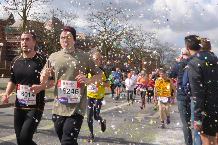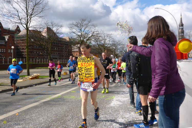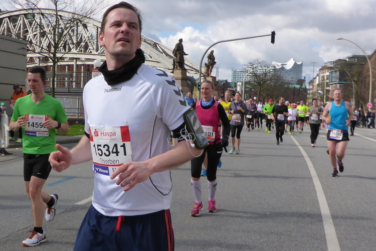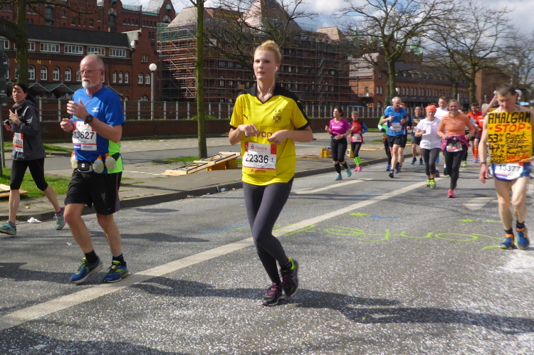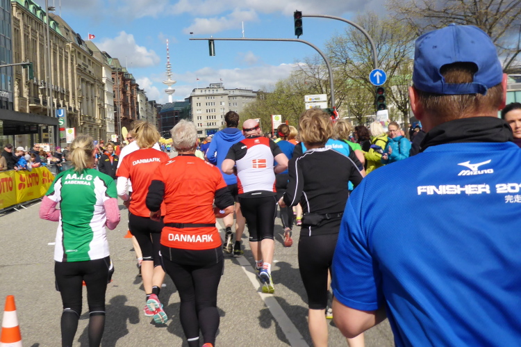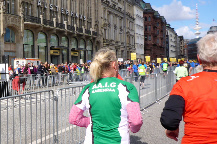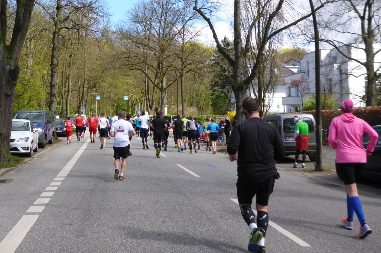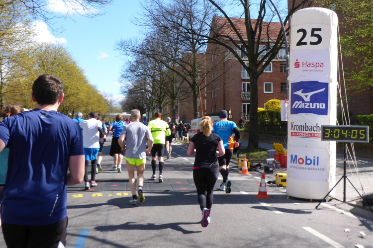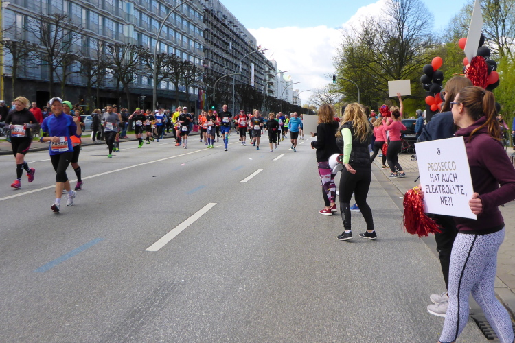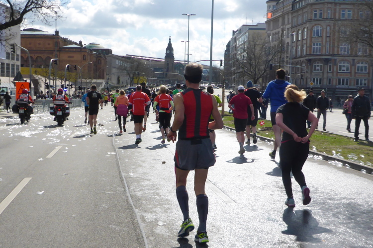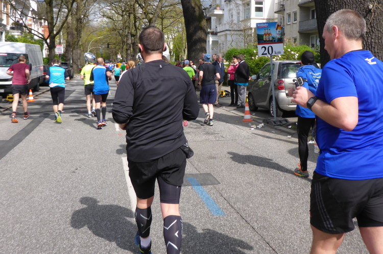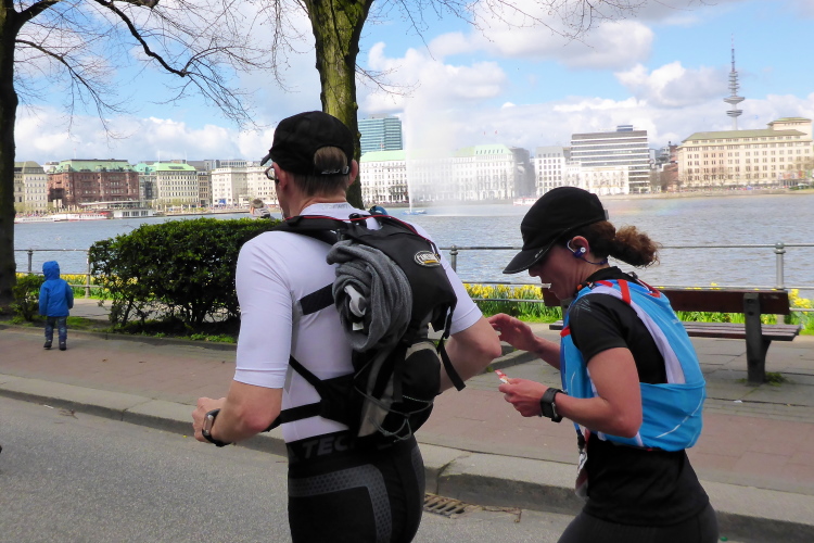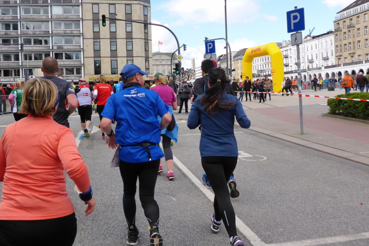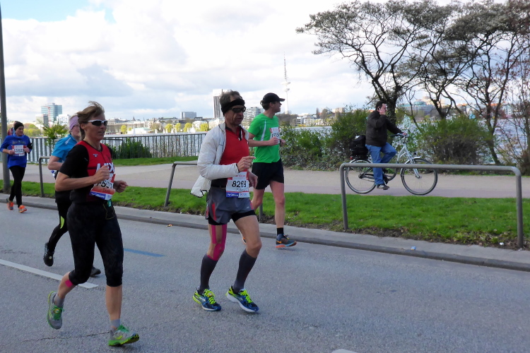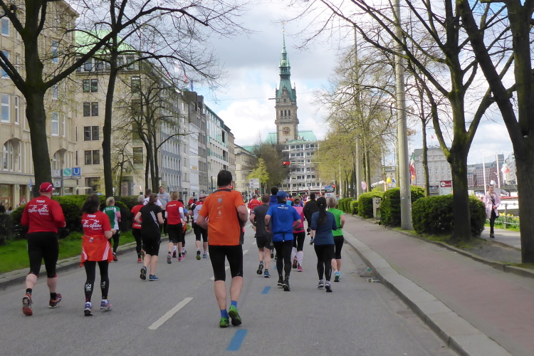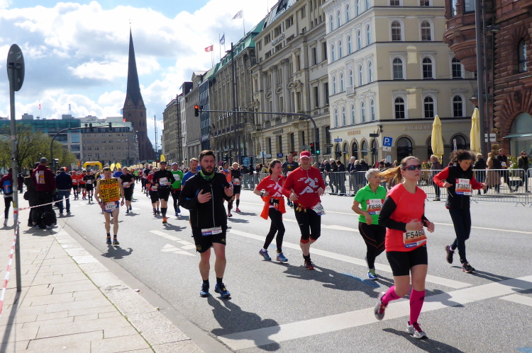 Es geht am Ufer der Außenalster entlang. Der größere, nördliche Teil des Alstersees ist circa 164 Hektar groß und bis zu 4,5 Meter tief. Nach den Highlights der ersten 20 Kilometer wird es nun ruhiger. Hier gibt es nicht mehr so viele Schaulustige, die den Läufern zujubeln. Dafür haben wir einen wunderbaren Blick auf die bunten Segelboote, die auf der Außenalster dahin gleiten. Es ist mächtig windig und hat auch beachtlichen Wellengang.