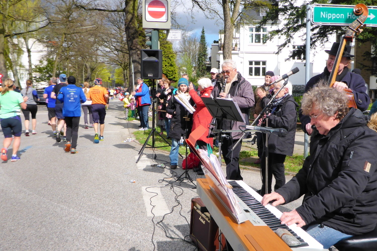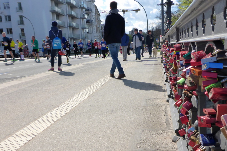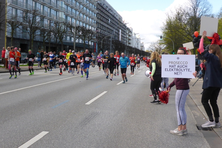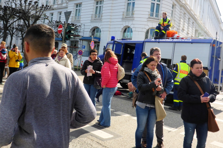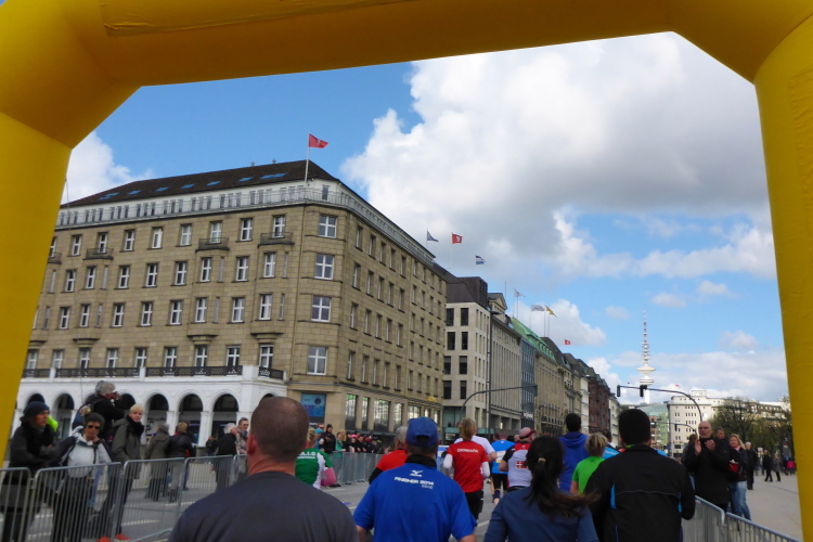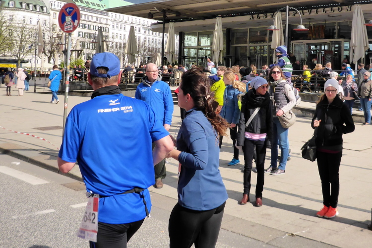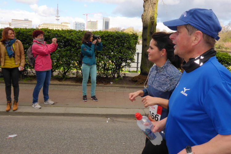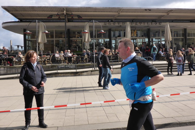 Wo früher unverheiratet Damen auf Bräutigamschau gingen, ist heute die Hölle los. Auf dem Jungfernstieg befindet sich die erste Wechselzone für die Staffelläufer (km 17). Natürlich hat sich auch das Fernsehen diesen wunderbaren Standpunkt ausgesucht, der viele Schaulustige anzieht. Der Moderator begrüßt die vorbeikommenden Läufer.