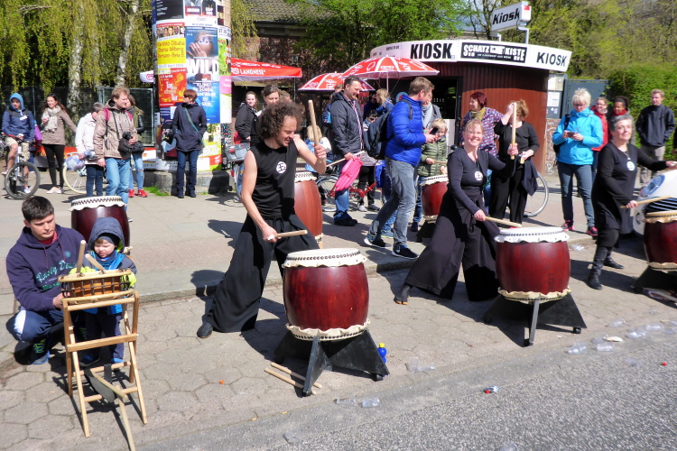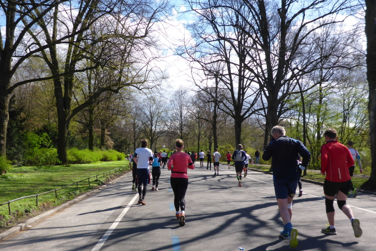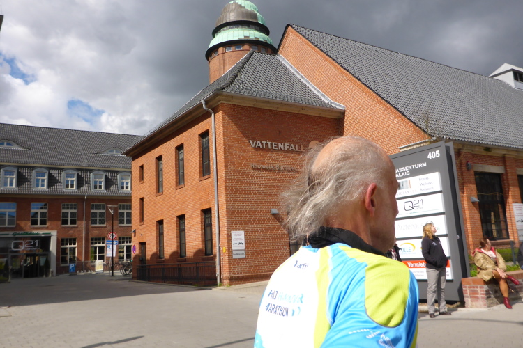 Bei km 23 erreichen wir den Stadtpark. Rein optisch meine ich, die Straße fällt ab, trotzdem sind meine Beine schwer. Norbert ist anderer Meinung: Er sieht die Straße ansteigen. Ob er mich nur trösten will? 40 % vom Hamburger Stadtgebiet sind Grünflächen, das kann man hier gut sehen. Außerdem kommen auf jeden Hamburger Hund statistisch 4 Bäume. Ein Paradies für bellende Vierbeiner.