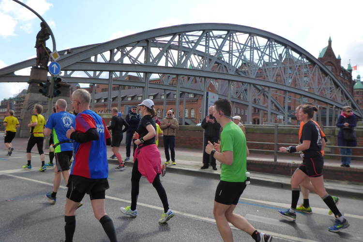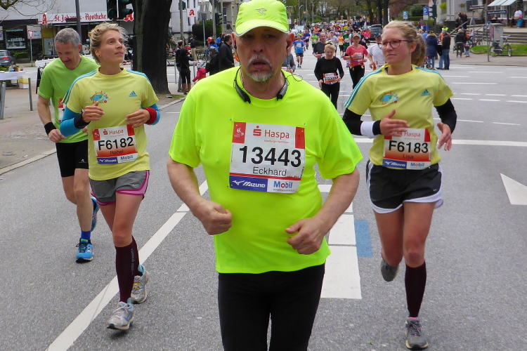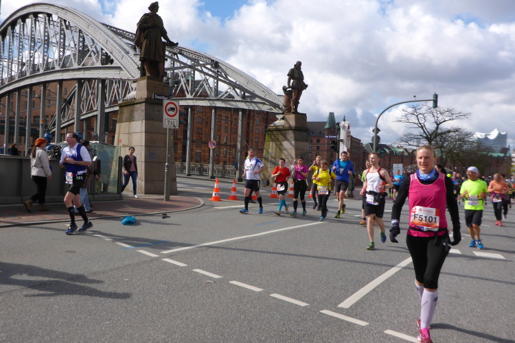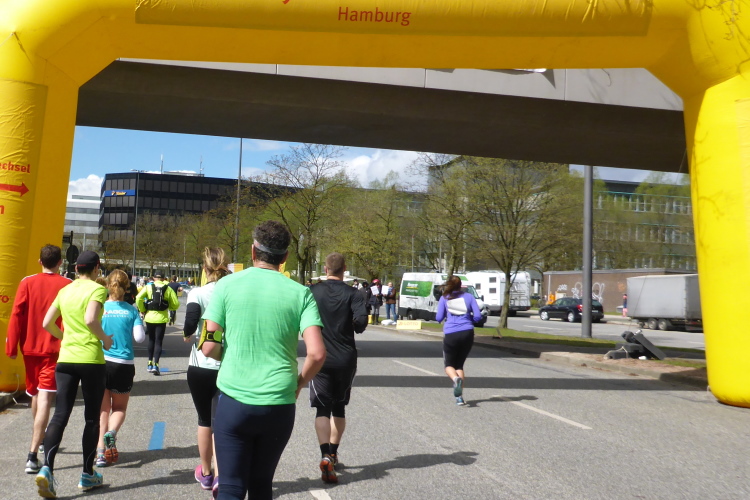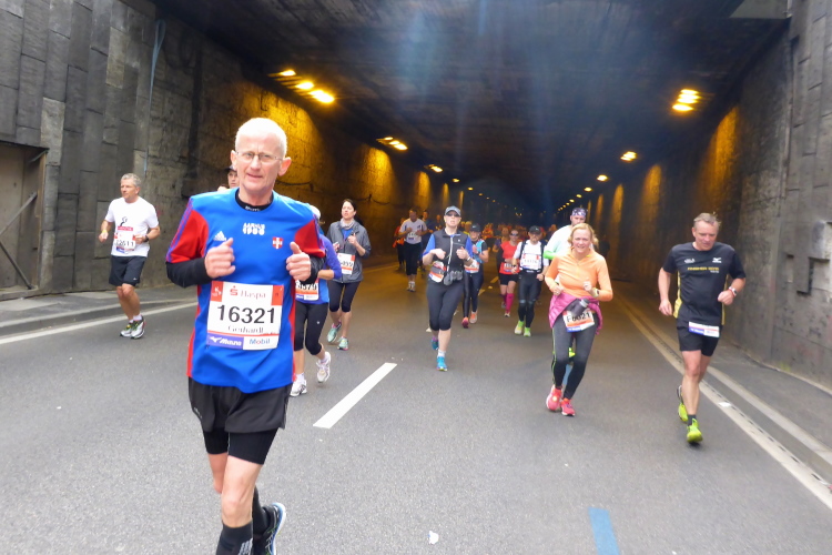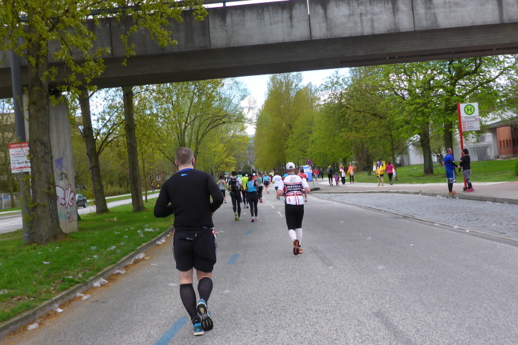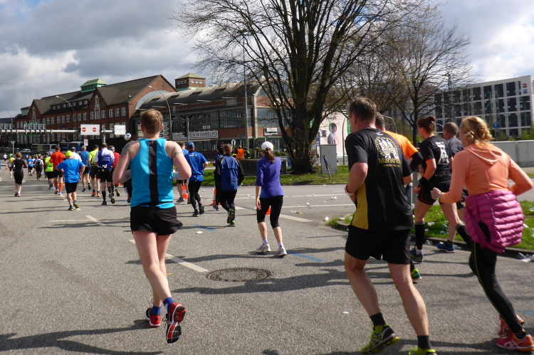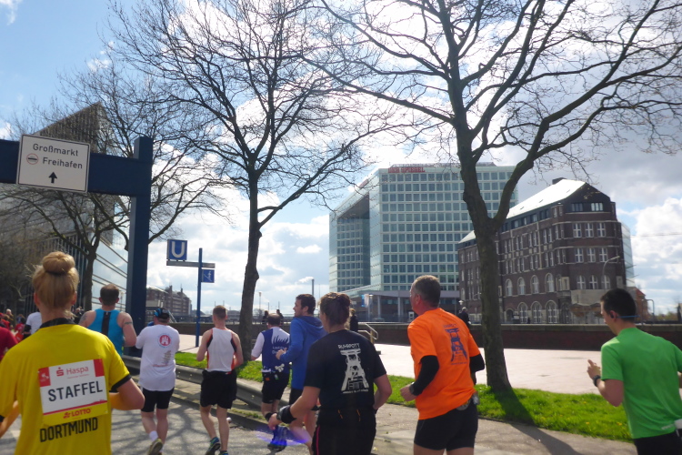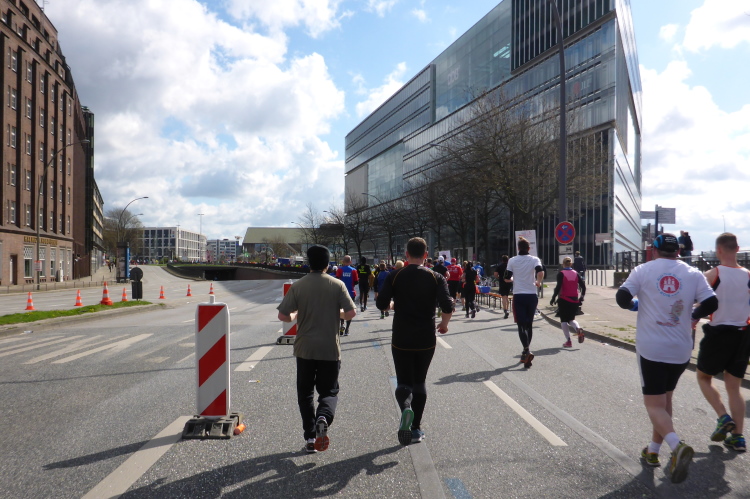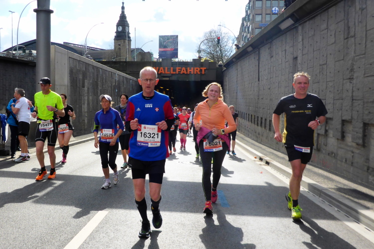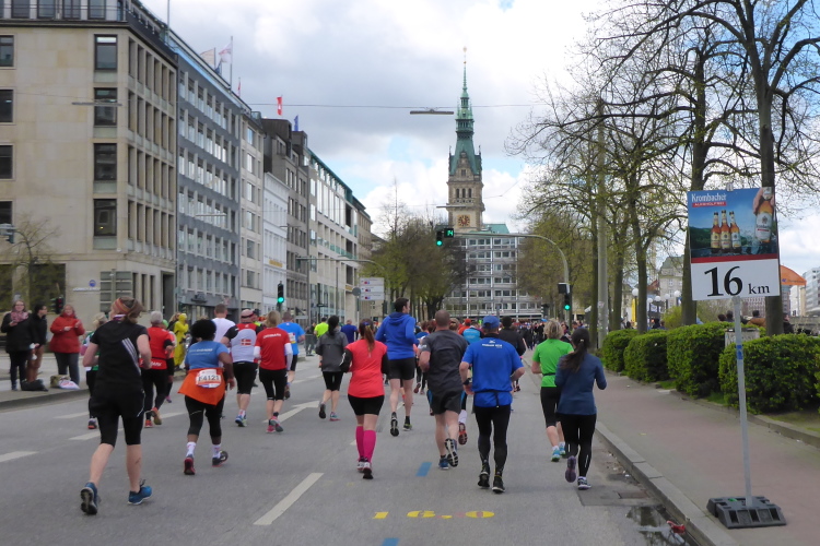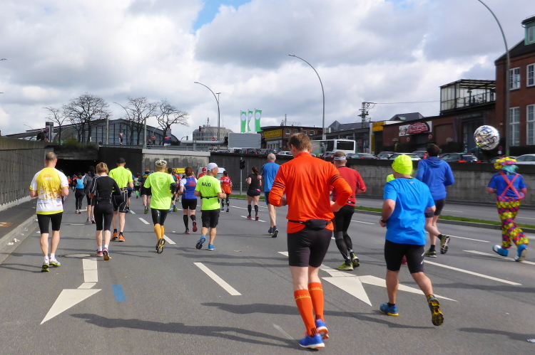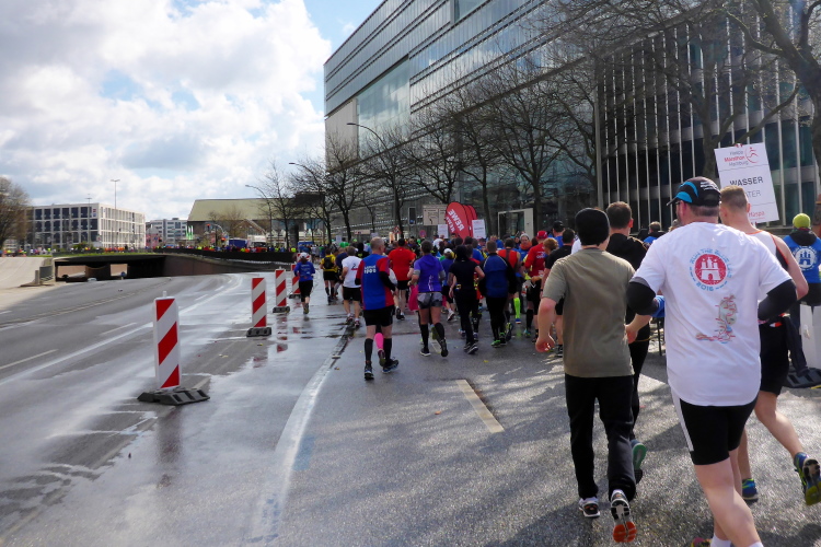Kurz vor km 15 laufen wir links Richtung Innenstadt. Auf dem Steintorwall geht es im Wallringtunnel unterirdisch am Hauptbahnhof vorbei. Im Tunnel ist es dunkel, alle paar Meter sind mit roten Lampen beleuchtet und es erklingt leise sphärische Musik. Was ist das bloß für eine bekannte Melodie? Dann fällt es mir ein: Es ist „Eye of the Tiger“, aber in einer Orchesterfassung. Ich genieße diese wunderbare Stimmung.