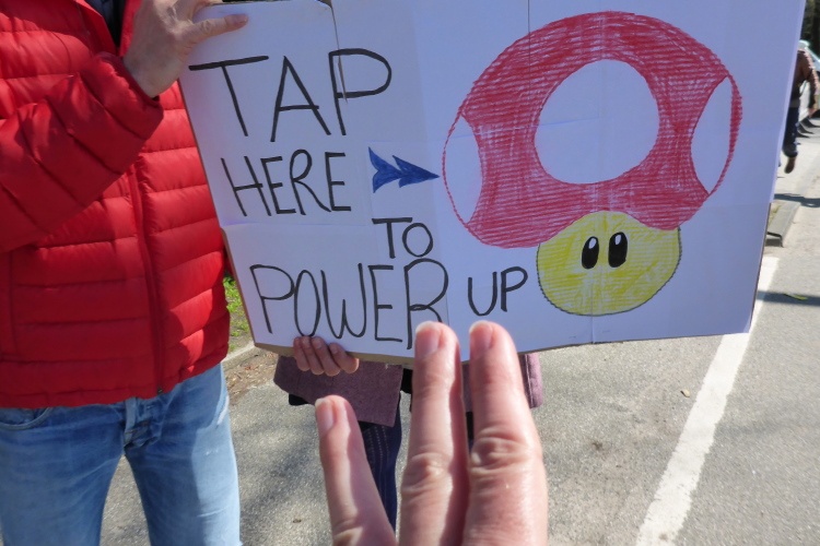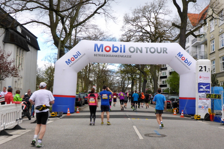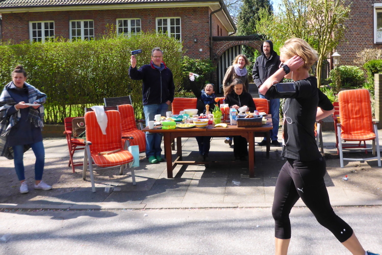 Bei km 21 stehen ein Marathontor und eine offizielle Zeitmessung. Die Digitaluhr bringt uns nicht viel, da es sich um die Bruttozeit handelt. Wir laufen auf einer gesperrten Straße an schönen Häusern und grünen Gärten vorbei. Hier haben die Anwohner Tische aufgebaut und ihr Essen oder Kaffeekränzchen nach draußen verlagert, um gleichzeitig die Läufer anzufeuern.