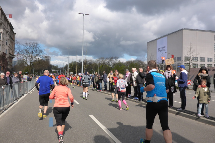 Über die Lombardsbrücke geht es zurück. Hier waren wir vorhin schon einmal und das Publikum hat die Möglichkeit, die Läufer gleich zweimal anzufeuern. Hinter der Brücke halten wir uns links, an der Hamburger Kunsthalle vorbei. Die Kunsthalle wurde renoviert und steht ab 30.04.16 dem Publikum wieder zur Verfügung. Damit sich jeder Interessierte ein Bild vom Umbau machen kann, ist der Eintritt den ganzen Mai über kostenlos.