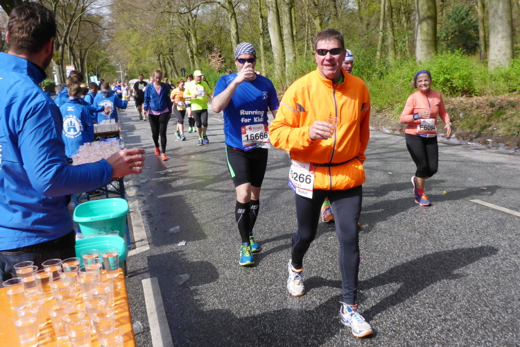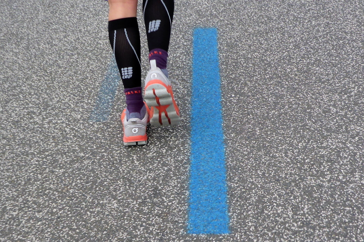 Verpflegung gibt es alle 5 Kilometer mit Wasser, Iso, Bananen und Gel, dazwischen kommen noch zusätzlich Wasserstellen. Ab km 25 wird auch noch Cola angeboten. Heute ist es mit Temperaturen um die 10 °C relativ frisch bei kaltem und etwas böigem Wind. Seit einiger Zeit beobachte ich skeptisch eine schwarze Wolke, die den Himmel verdunkelt. Aber Regen war erst für den späten Nachmittag angesagt. So sind wir guter Hoffnung, dass das Wetter noch hält.