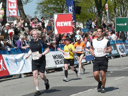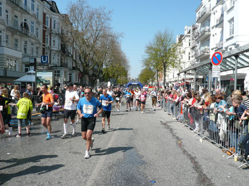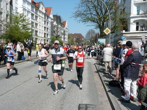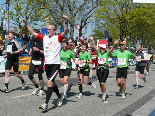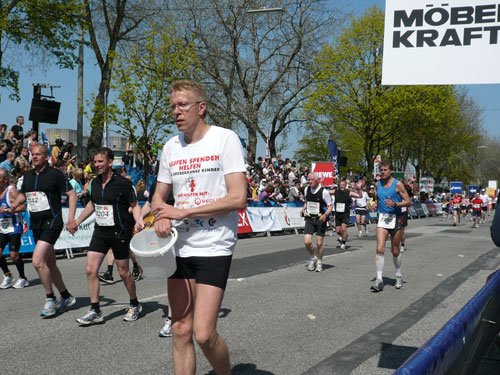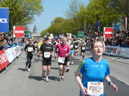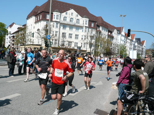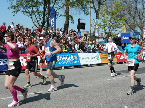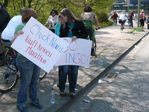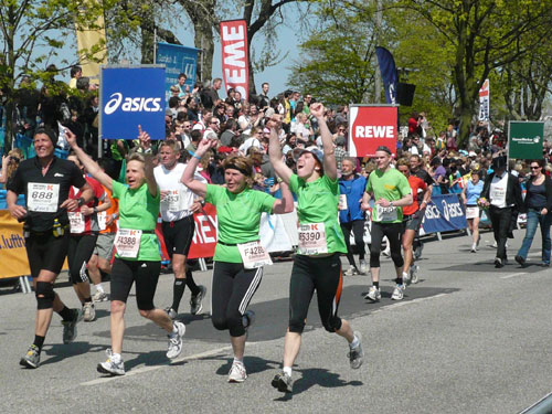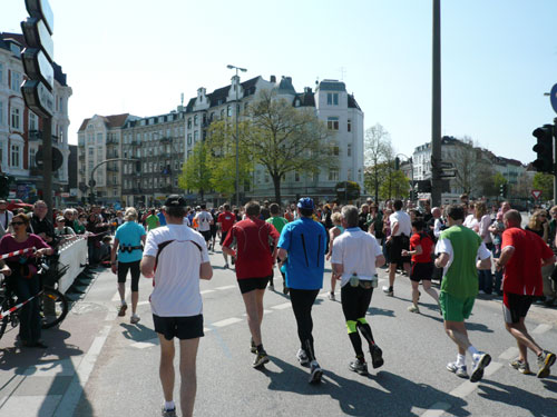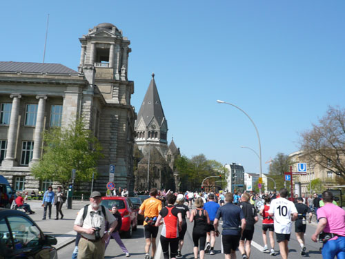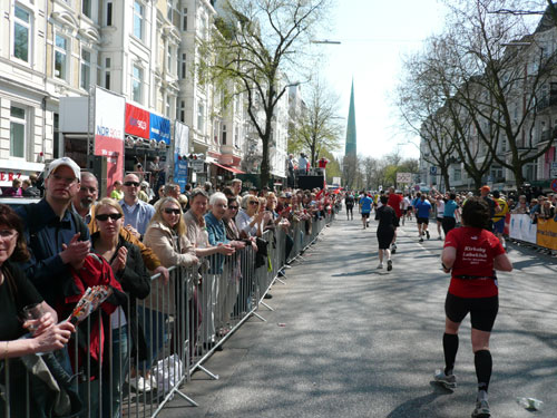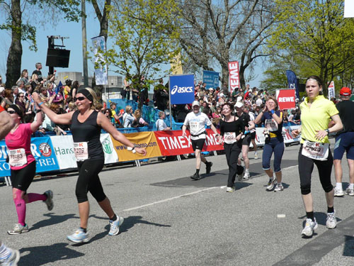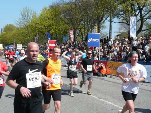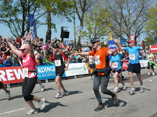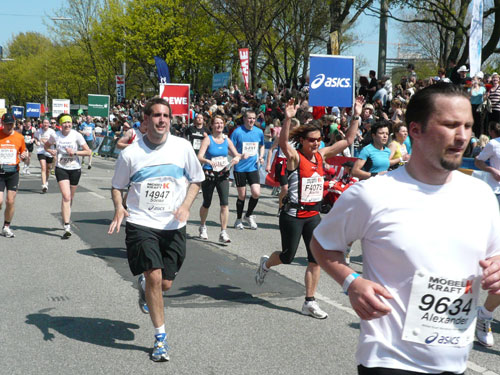 Gestern bildeten 100.000 Menschen bei der Anti-Atomkraft-Demo eine 120 Kilometer lange Kette zwischen den abgeschalteten Atomkraftwerken Brunsbüttel und Krümmel mit Schwerpunkt Hamburg. Wenn sich heute alle an den Händen fassen würden, könnte man wahrscheinlich einen zig-fachen Ring um die komplette Marathonstrecke legen. Bei allen Problemen des Veranstalters, die Menschen aus Hamburg und Umgebung lieben ihren Marathon, das kann man uneingeschränkt behaupten.