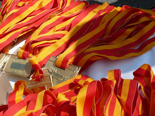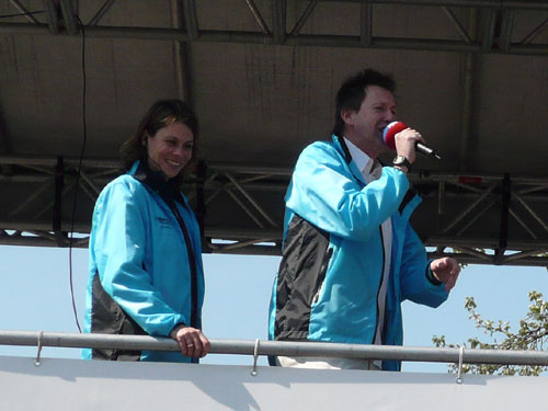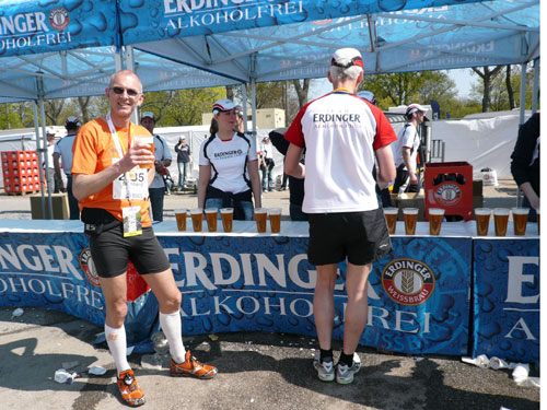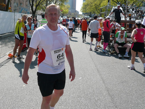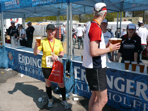 Auf der Glacichaussee geht’s rein ins Ziel, wie überall auf der Strecke das gleiche Bild, alles voll besetzt. Ich muss noch eine halbe Minute vor dem Zielbanner warten, will mal versuchen ob ich mein Geburtsdatum stoppen kann. Die Minuten haben gepasst, aber um 5 Sekunden bin ich daneben. Nachdem ich mit der Medaille meinen verdienten Lohn abgeholt habe, gehe ich nochmal zurück zum Zieleinlauf um noch ein paar Eindrücke einzufangen. Da läuft mir schon Johannes B. Kerner in die Arme: „Wo gibt’s die Medaillen?“ ist er ganz scharf darauf zu wissen. 4:35 ist er gelaufen. Respekt, für so einen megapräsenten Fernsehmann eine super Leistung.