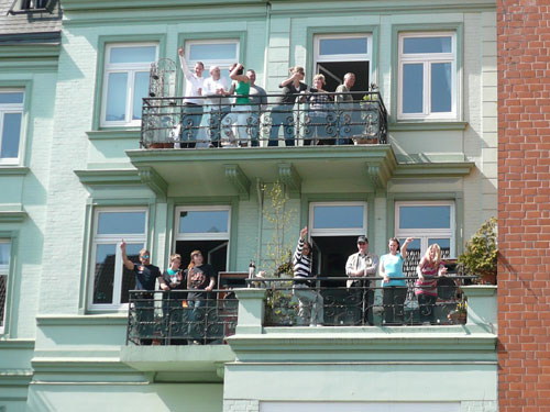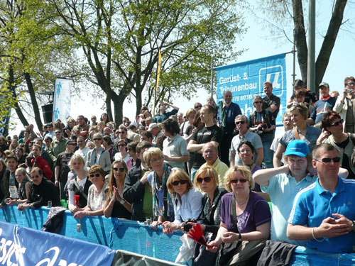 Unglaublich, aber es gibt sogar noch eine Steigerung. Phänomenal, was sich zurück in der Innenstadt zwischen Alsterglacis, Neuen Jungfernstieg und Esplanade abspielt. Durch ein vielleicht zwei bis drei Meter breites Spalier dürfen wir einige hundert Meter hindurch. Mehr Begeisterung geht kaum, das ist Central-Park-Feeling pur. Sogar noch besser und intensiver, dort ist die Straße nämlich mindestens zwei-bis dreimal so breit. Ich würde gerne diese Stimmung auf der Chipkarte festhalten, geht aber nicht, es ist so eng, dass ich glatt überrollt würde. Ich versuche es mal wie Joe, der macht das immer im Laufen. Das Ergebnis ist aber nur befriedigend, anvisieren und abdrücken, mehr ist einfach nicht möglich in der Enge. Schade, dieses Wahnsinns-Erlebnis hätte ich gerne besser im Bild gehabt.