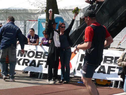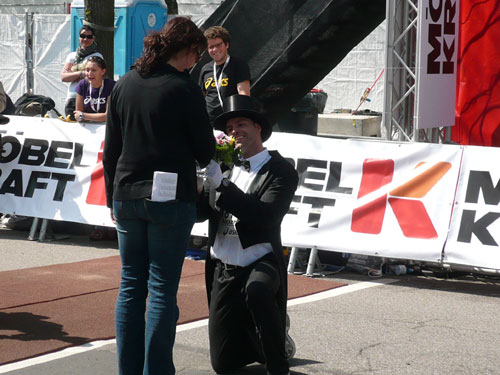 Dann wird’s fast kitschig oder doch romantisch? Alexander im Bräutigamkostüm mit Zylinder kniet auf der Ziellinie nieder und macht seiner Freundin einen Heiratsantrag. Die ist völlig überrascht, sagt aber „ ja“. Nach einander kommen ein Wasserträger, Spidermann und ein König ins Ziel. Heute haben alle ihren Spaß gehabt, da bin ich mir sicher.
