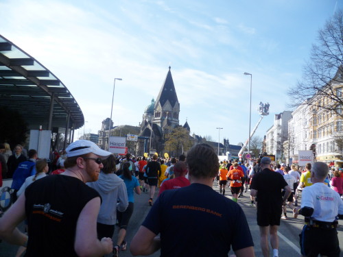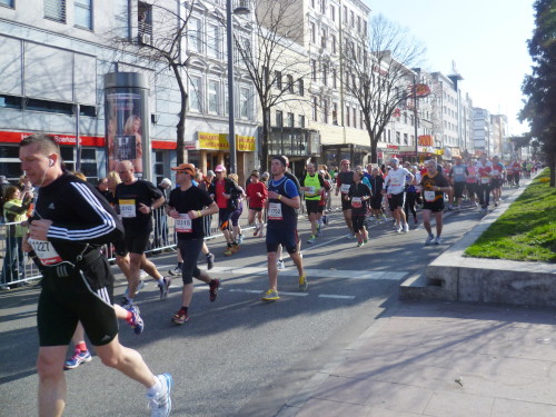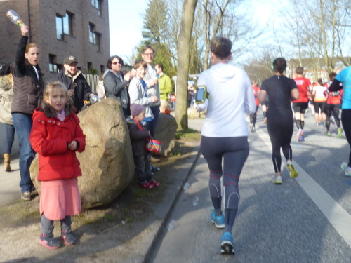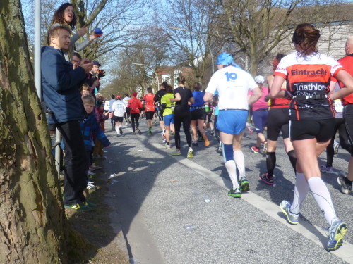 Die Häuserschlucht der "Holländische Reihe" nimmt uns auf. In vielen Fenstern und auf Balkonen stehen die Bewohner und feuern uns an (km 4). In der Bernadottstraße treten die Häuser in kleine Gärten zurück. Dafür kommen die Menschen hier an die Straße. Einzeln oder in Gruppen haben sie allerlei Instrumente dabei und machen Lärm um uns anzufeuern (km 5 und 6).