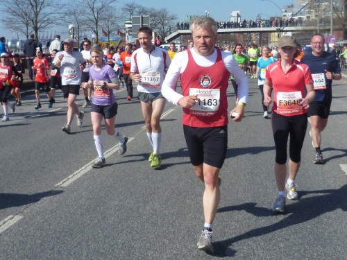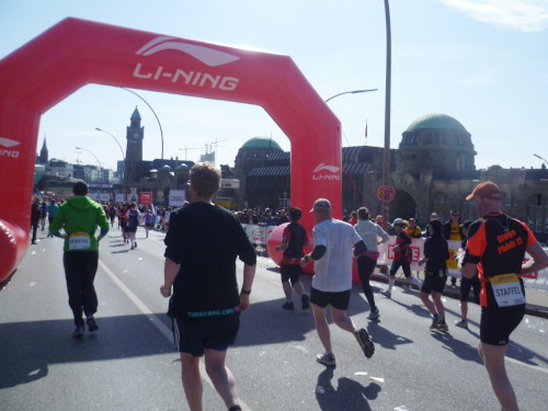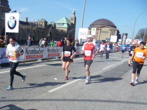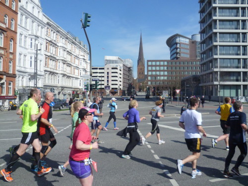 Es geht bergab und wir haben ein grandioses Bild vor Augen: im Hintergrund die großen Verladekräne des Hafens und davor Menschenmassen, die nur gekommen sind, um uns Läufer zu bewundern. Gänsehautfeeling pur. Unten geht es um eine Kurve und dann geradeaus auf dem Fischmarkt und der Hafenstraße entlang. Seit 1703 darf auch sonntags vor dem Kirchgang in Altona Handel getrieben werden. Seither ertönen auf dem Altonaer Fischmarkt jeden Sonntag die Glocken. 1896 wurde die im Stil einer dreischiffigen Basilika erbaute Fischauktionshalle eröffnet. Noch heute versorgt der sonntägliche Markt Einheimische mit Schnäppchen und Touristen mit Einkaufserlebnissen (km 12).