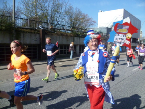 Insgesamt sind heute 100 Läufer und 100 Schulkinder unterwegs, um Spenden bei den mehreren hunderttausend Zuschauern des HASPA Marathons sammeln. Man erkennt sie an den weißen T-Shirts mit den bunten Logo-Aufdrucken der Firmen, die ebenfalls spenden (km 7, 8, 9 und 10).