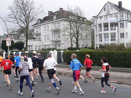 Durch die kluge Aufteilung in die Startblöcke (und die Disziplin der Teilnehmer) ist praktisch von Anfang an ein gleichmäßiges Laufen möglich. In der schmaleren Holländischen Reihe und später in der Bernadotte Straße wird es zwar zeitweise etwas enger, aber das stört nicht groß, denn gleich wird die Stimmung dadurch gleich noch einmal besser. Außerdem lösen sich die Schleierwolken auf und die Sonne kommt raus. Es ist ein herrlicher Sonntagmorgen, zu dem das Geläut der Kirchenglocken jetzt ganz besonders gut passt.