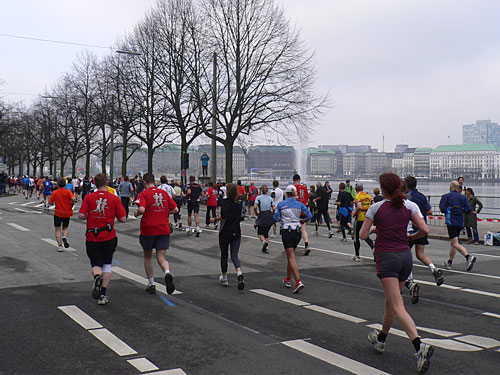 Schon bald sind wir auf dem Millerntordamm und von rechts kommen nach einander die Läuferinnen und Läufer aus den anderen Startblöcken. Auf der Reeperbahn fehlen heute etwas die Zuschauer, weil durch die Baustellen alles sehr beengt ist. Trotzdem ist die Stimmung gut und der Lauf durch das Hamburger Vergnügungsviertel mit den vielen Bars, Kinos und Spielcasinos hat schon etwas ganz Besonderes. Dazu gehören natürlich auch ein paar aus der Nacht übrig Gebliebene, die sich trotz ihrer unsicheren Gehweise den Marathonis ein Stück anschließen.