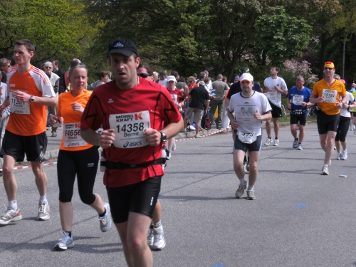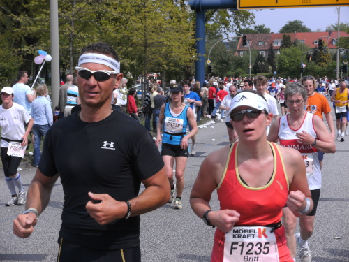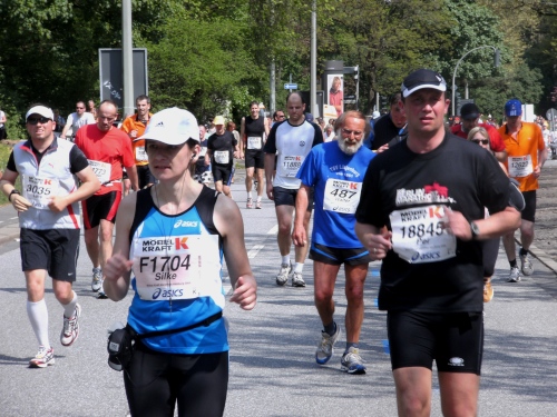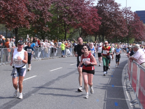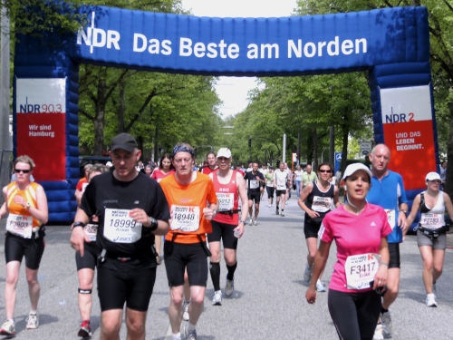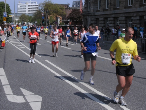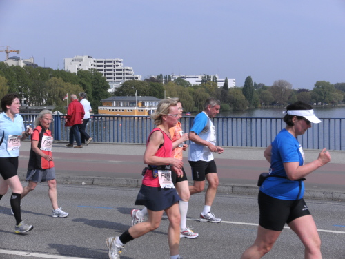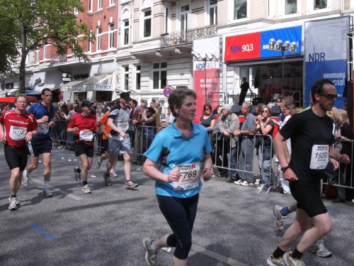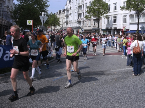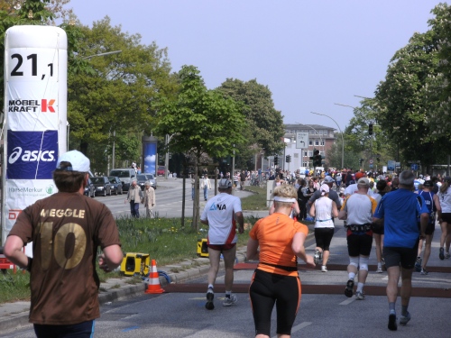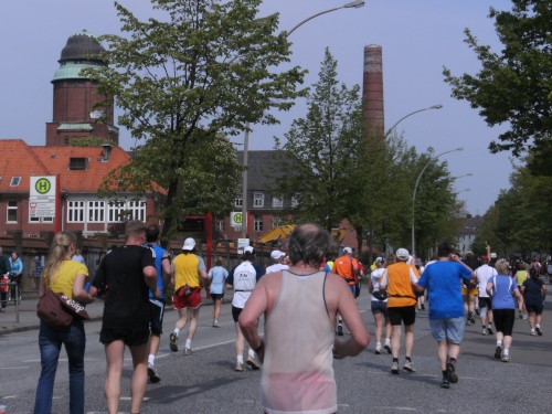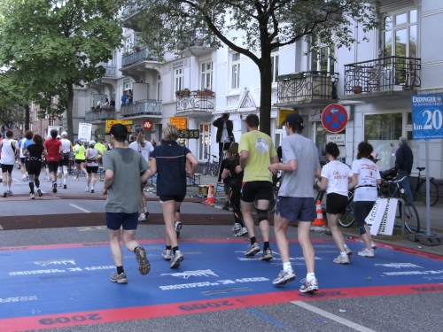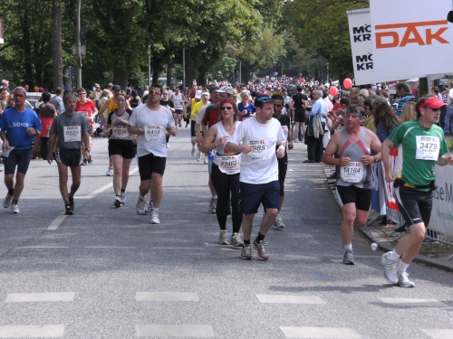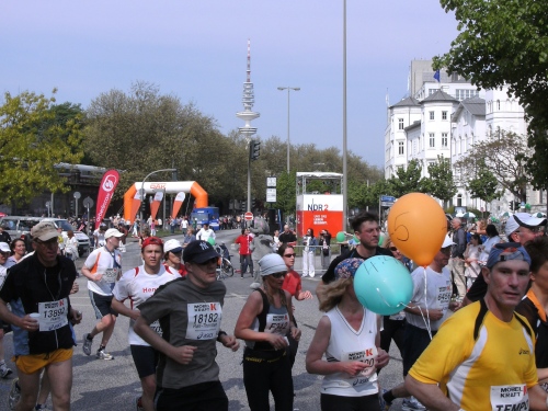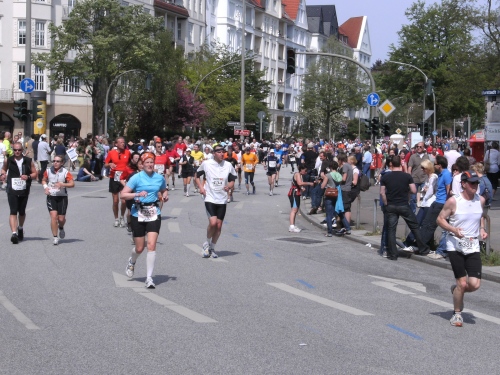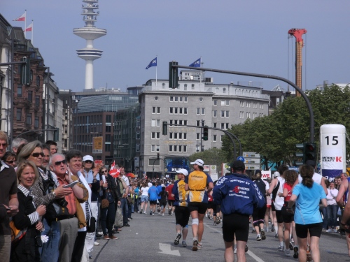 Über die Elbchaussee laufen wir mit Blick auf den Hamburger Hafen und die dortigen gewaltigen Kräne vorbei am Fischmarkt und die Landungsbrücken. Überall stehen Menschenmassen und feuern die Läufer an. Stimmung pur!