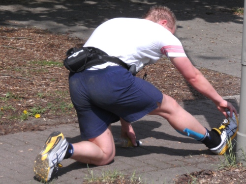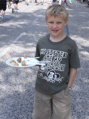 Angesichts der hohen Temperaturen war Trinken noch stärker als sonst ein Muss. Es gab aber reichlich Gelegenheit dazu. Neben den VS des Veranstalters gab es immer wieder auch private Verpflegungsstellen. So reichte ein Junge gekochte Kartoffeln in handlich kleingeschnittener Größe und freundliche Damen Kekse. Ich habe zuerst den Jungen und die Damen mit ihren Angeboten fotografiert und mich dann nicht zweimal zum Verzehr auffordern lassen. Soviel Zeit muss sein. Dank auch diesen freundlichen Zuschauern.