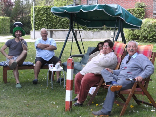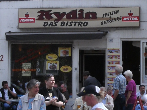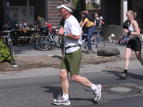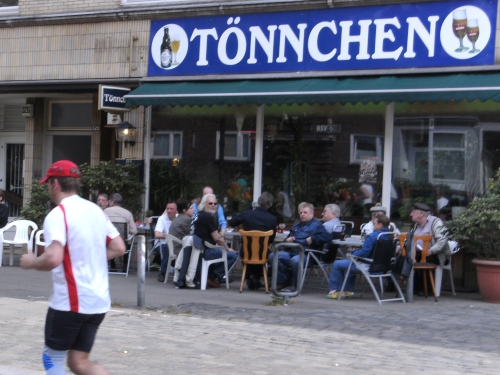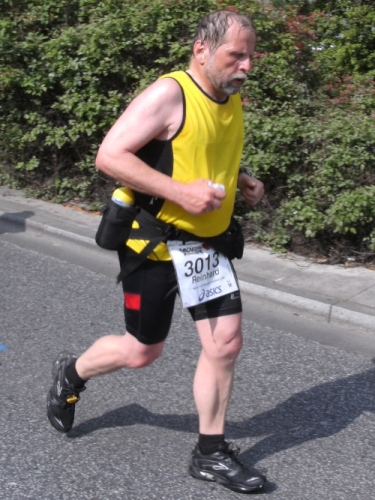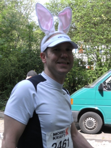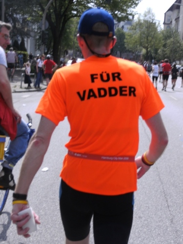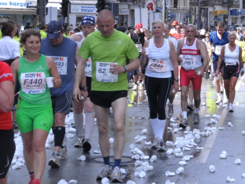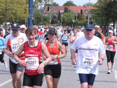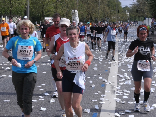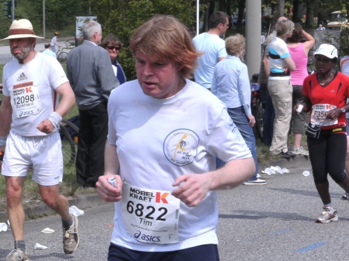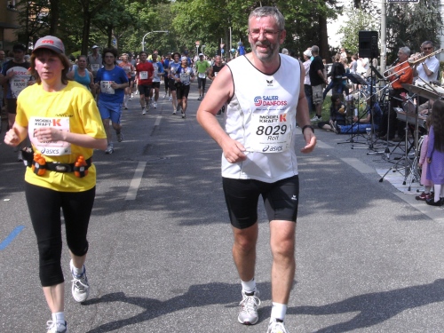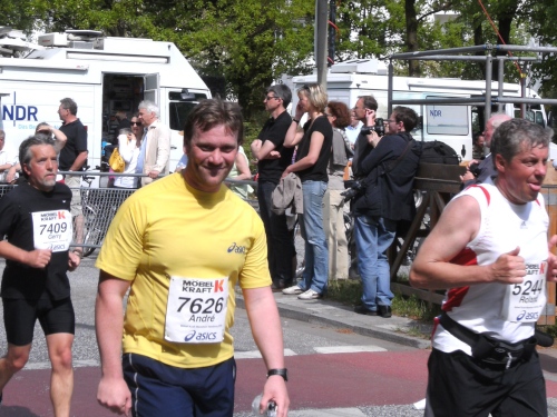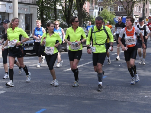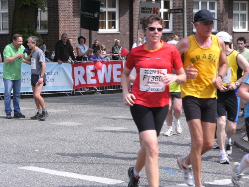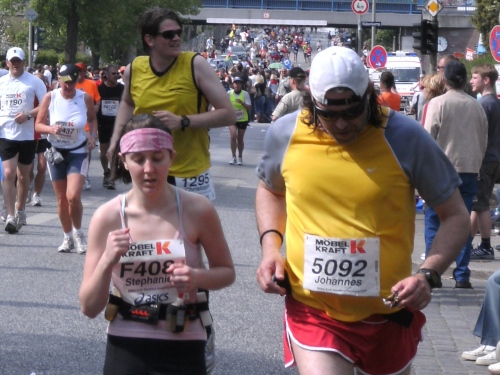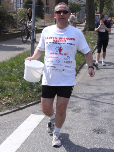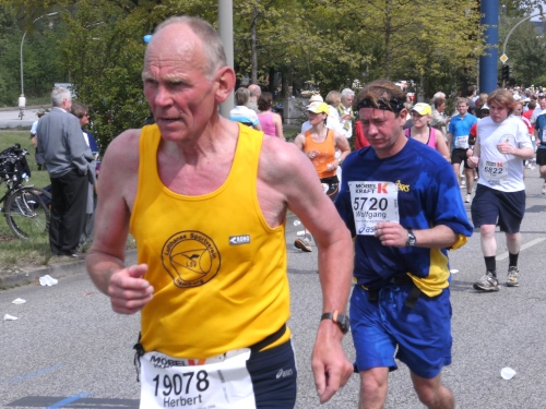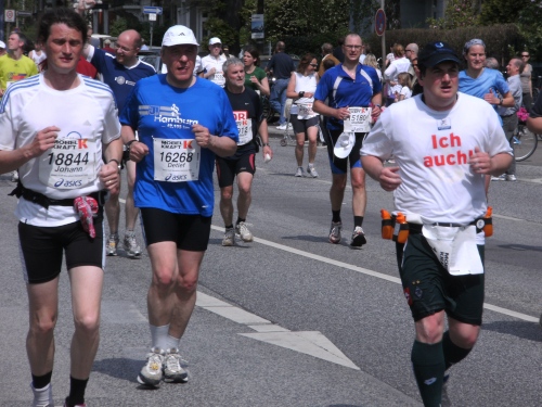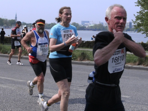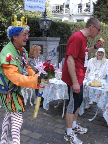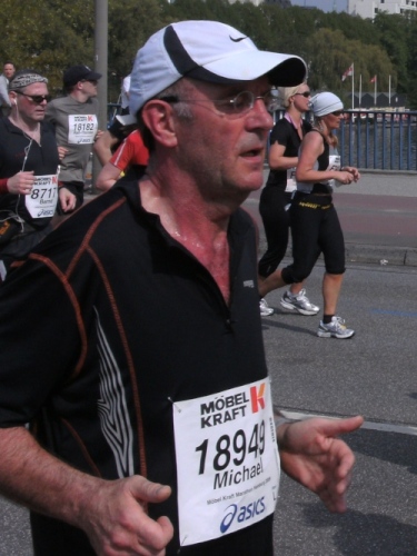 Die Kulisse des Hamburger Hafens allein wäre schon eine Teilnahme am Marathon wert. Am Fischmarkt sehe ich auch Michel Descombes. Er läuft wie immer verkleidet. Das laufende Baguette wird wieder – absichtlich - Letzter in 6.25,30 Std. Auch er hat sicher jede Minute des Laufes genossen. Ich sehe ihn noch öfters. Einmal an einer Kaffee/Frühstückstafel. Vielleicht hat er dort nach einem richtigen Baguette gefragt.