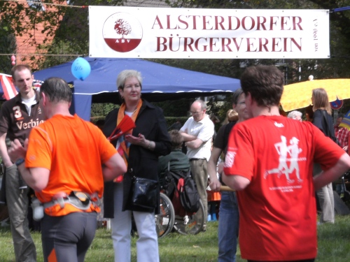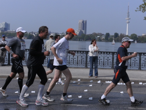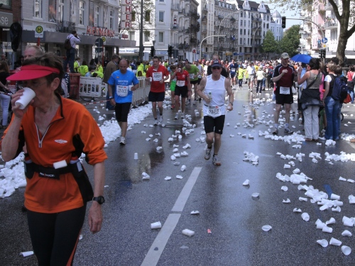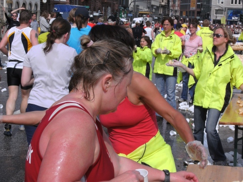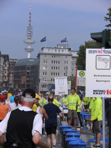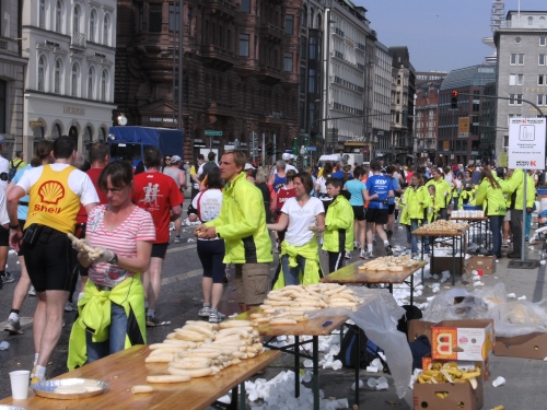 Die VS sind in Hamburg nur auf der rechten Seite aufgebaut. Dies führt zu Gedränge, das mit einem Aufbau von VS parallel auf der linken Seite zu vermindern wäre. Auch könnten die VS früher angekündigt werden, damit sich die Läufer darauf einstellen können. Das sind aber schon meine einzigen Anregungen für Verbesserungen des ansonsten perfekt organisierten Laufes.