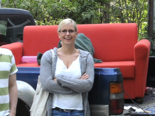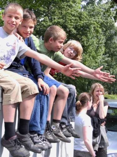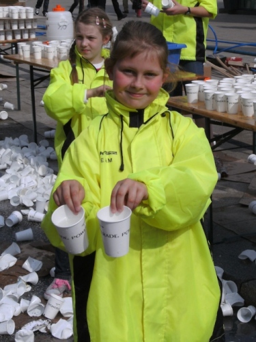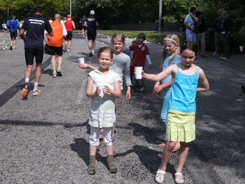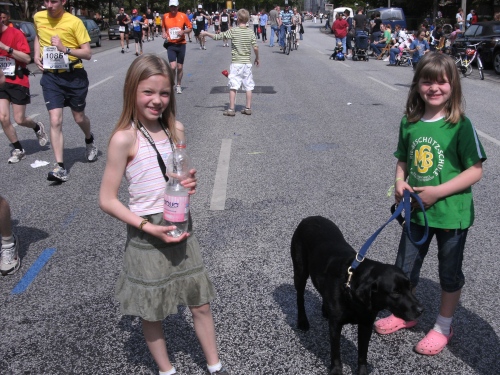 Plötzlich sehe wieder eine private Versorgungsstelle. Kleine Mädchen stehen an der Strecke und bieten Wasser in Bechern an. Ich nehme einen Becher, trinke einen Schluck und bitte dann eine Kleine darum den Rest des Bechers in meine Kappe zu schütten. Wir haben beide unseren Spaß an der Aktion.