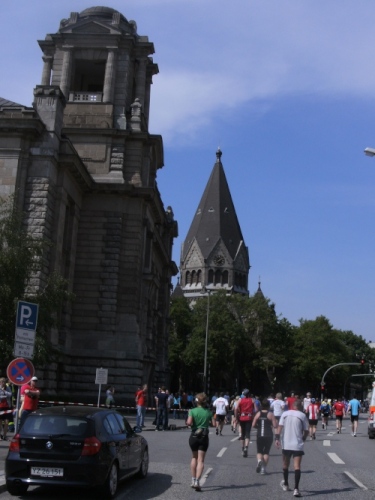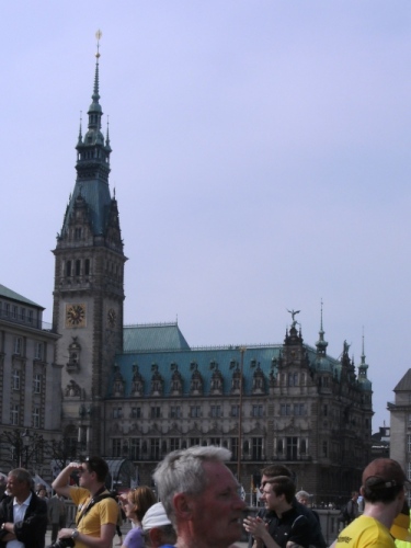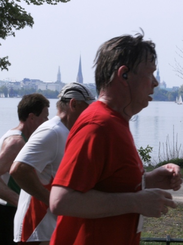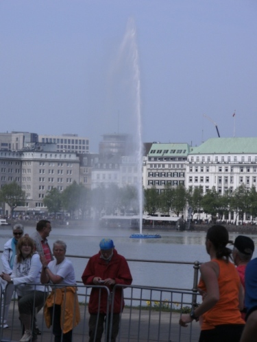 Plötzlich gibt die Strecke den Blick auf die Binnenalster frei. Ein wunderschöner Blick mit Fernsehturm im Hintergrund und Wasserfontäne mitten in der Wasserfläche. Beim Umlaufen der Binnenalster wird KM 15 passiert. Fast hätte ich das Hamburger Rathaus linker Hand der Laufstrecke übersehen.