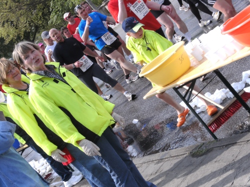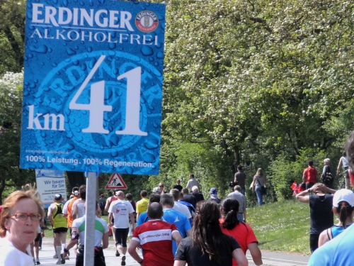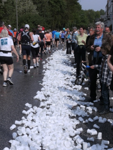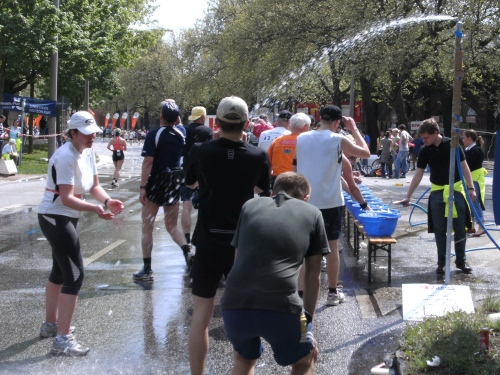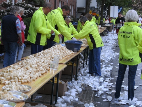Die Verpflegungsstelle (VS) bei KM 15 ist wie die anderen auch bestens bestückt. Alle 5 Km gibt es eine VS mit Wasser, Bananen und ab KM 15 Isogetränk. Zudem gibt es ab KM 7,5 alle 5 KM Wasserstellen. Des Weiteren werden bei KM 10, 20 und 30 Kohlenhydratgetränke angeboten. Insgesamt flossen etwa 83.000 Liter in durstige Läuferkehlen.