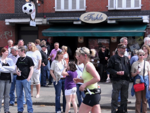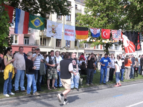 Entlang der Strecke sieht man immer wieder Fahnen des Weltpokalgewinnerbesiegers FC St. Pauli. Sie gewinnen eindeutig das Duell gegen die HSV-Fans/Fahnen.