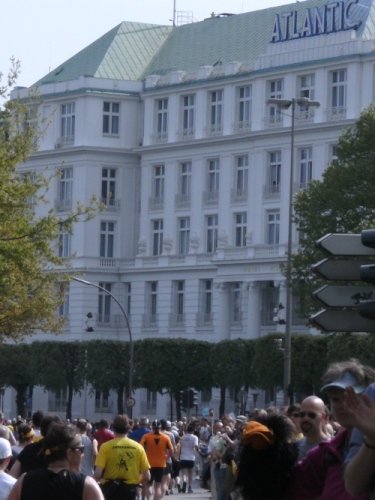 Nach dem Überlaufen der Brücke zwischen Binnen- und Außenalster kommen wir vorbei am Hotel Atlantic. Hier wohnt Deutsch-(Alt)Rocker Udo Lindenberg. Udo steht jedoch nicht unter den Zuschauern. Wahrscheinlich malt er gerade wieder Likörelle an der Hotelbar.