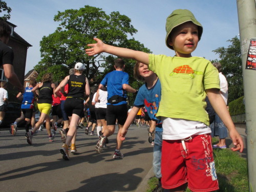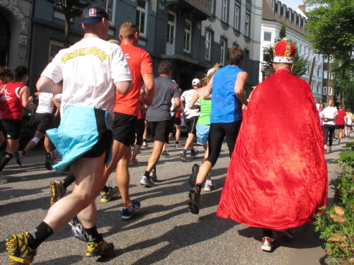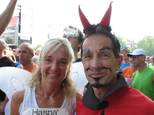 Schon einen weiteren Block weiter hinten interessiert das keinen mehr. Dort klettert gerade „Engelchen“ Susanne über die Absperrung. „Pass auf Deinen Schwanz auf“, ermahnt sie „Teufel“ Jürgen, der ihr auf gleichem Weg folgt. Er dreht sich um, schaut auf das lange schwarze Ding und meint: „Nix passiert!“ Glück gehabt. Die Zwei mit der Startnummer 666 sind übrigens himmlisch gut und teuflisch schnell unterwegs, 3:43. Haben wohl sonntags noch was anderes vor.