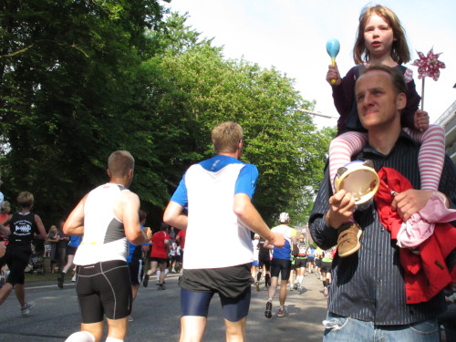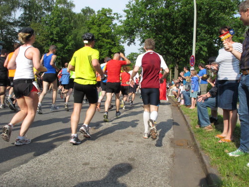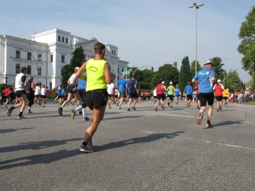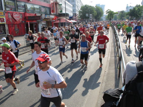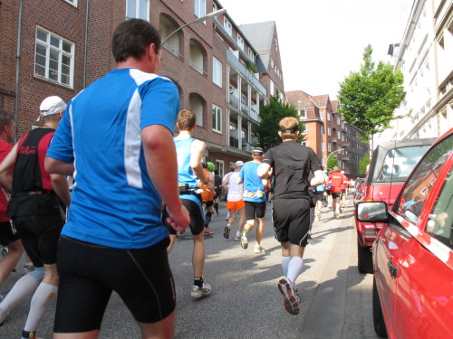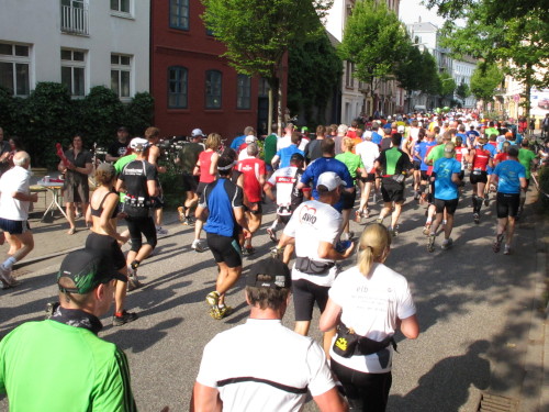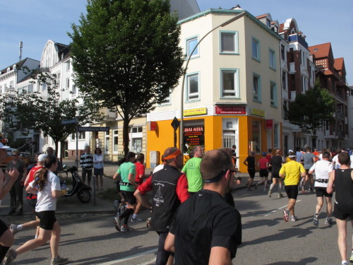 Wegen einer Baustelle im ersten Streckendrittel befürchtet man Engpässe. Deshalb hat man sich kurzfristig zu zeitversetzte Blockstarts entschieden. Davon profitieren die Läufer schon jetzt, denn jeder findet seinen Rhythmus. Noch nicht einmal in der Holländischen Reihe, als die Straße durch die roten Backsteinhäuser wesentlich enger wird, gibt es ein Problem.
