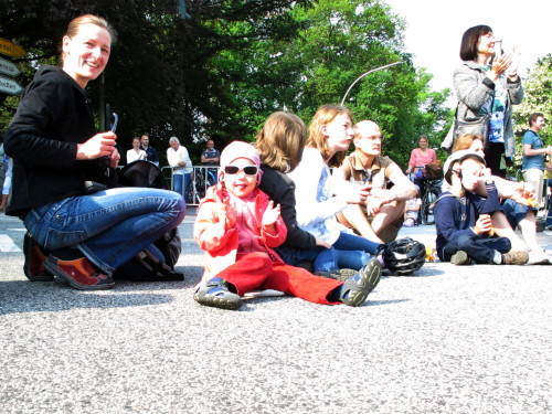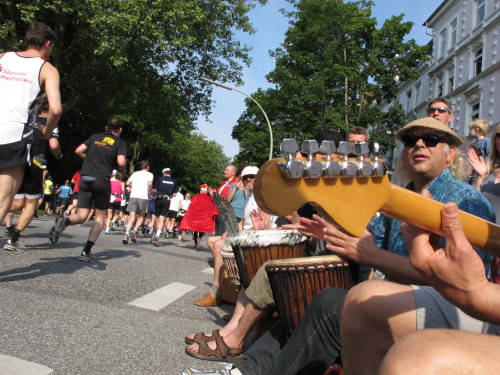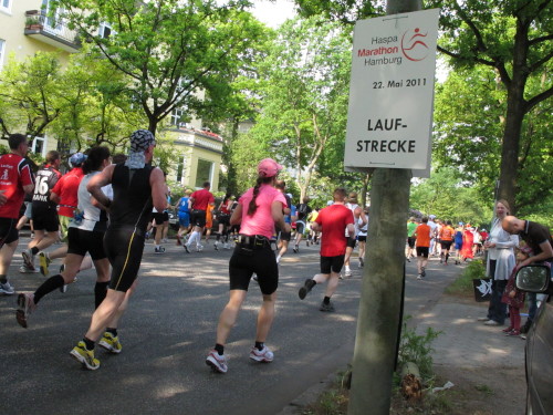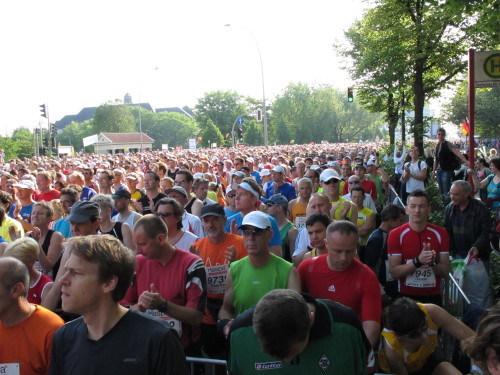 Auf St. Pauli gilt absolutes Schusswaffenverbot. Auch für Olaf Scholz, den Ersten Bürgermeister. Deshalb gibt es keinen Startschuss, sondern es wird „angeglast.“ „Mit einer Schiffglocke geläutet“, könnte man auch etwas umständlicher sagen. Zuvor gibt es traditionell „Hamburg an der Elbe Auen“ und dann die Nationalhymne, live gesungen von Benno Schöning. Dann hält uns hier nichts mehr. Die vielen Zuschauer geben den Marathonis schon einmal einen Vorgeschmack darauf, was Marathon in Hamburg heißt.