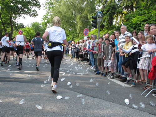 Gedränge gibt es erst an der Getränkestelle, weil …. Ich kann es selber nicht mehr hören. Am ersten Tisch prügelt man sich fast um einen Becher Wasser, am letzten wird es warm, weil es keiner will. Warum sagt das den Rookies keiner, bevor man sie auf die Strecke lässt?