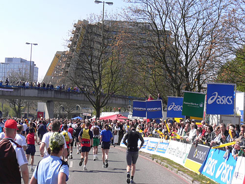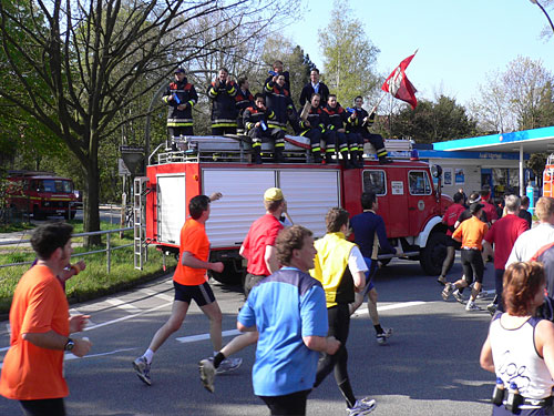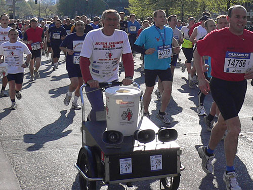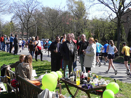 Wie jedes Jahr sammeln junge Leute, die entweder ein Teilstück von 10 Kilometern oder auch den ganzen Marathon laufen, bei den Zuschauern für Krebskranke Kinder. Einer fährt mit dem Fahrrad voraus und kündigt die Sammler an. Letztes Jahr kamen so 17.000 Euro zusammen, erzählt mir ein junges Mädchen. Links von mir sehe ich Michel, der seine Späße mit dem Publikum macht und heute bestimmt keine Bestzeit läuft.