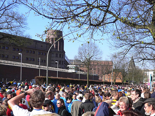 Und so kommt es dann auch. Keine Wolke am Himmel. Aber empfindlich kalt ist es am Sonntagmorgen. Nicht viel über Null, schätze ich mal. Aber es sollen bis zu 15 Grad werden, und die Kleiderwahl ist schnell entschieden. Unten kurz und oben T-Shirt. Von meinem Quartier "Baseler Hof" brauche ich zum Startgelände an der Messe gerade mal 10 Minuten.