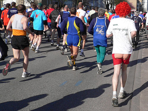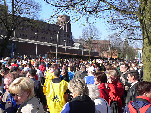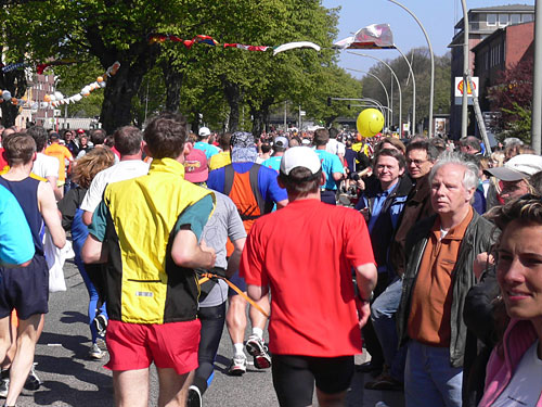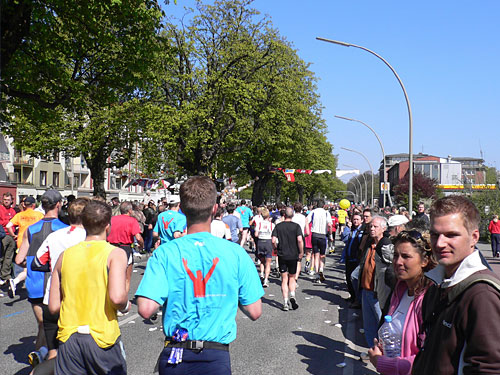 Die letzten Minuten vor dem Start. Die übliche Nervosität. Aus den Lautsprechern Heidi Kabel mit „In Hamburg sagt man tschüss“, und los geht’s. Über die erste große Kreuzung weg und schon sind wir auf der Reeperbahn. Rechts und links Bars, Kinos und Spielbuden. Und ein begeistertes Publikum. Einige sind von der Nacht übrig geblieben. Immer wieder Totenkopffahnen und die des FC St. Pauli. Das geht gut los. Durch die kluge Aufteilung in die Startblöcke (und die Disziplin der Teilnehmer) ist praktisch von Anfang an ein gleichmäßiges Laufen möglich. In der schmaleren Holländischen Reihe und später in der Bernadotte Straße wird es zwar enger, aber das hebt die Stimmung nur noch mehr.