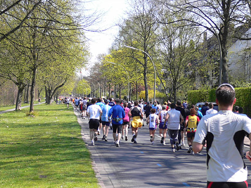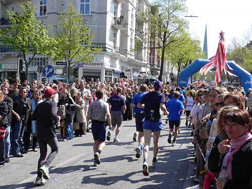 Zwischen Alsterdorf und Ohlsdorf dann wieder viel Grün und sogar etwas Wald und immer entlang der Alster. Bei Kilometer 28 wieder ein Blick auf die Uhr: 2 Stunden 43. Ich laufe dieses Tempo gar nicht wirklich, ich lasse mich treiben und tragen. Es macht einfach Spaß, riesigen Spaß. Links geht es über die Hasenbergbrücke und dann gleich wieder links auf den Maienweg, einer Allee mit schönen kleinen Siedlungs- und Reihenhäusern. Die ganze Bevölkerung muss hier auf den Beinen sein. Es sind noch 10 Kilometer zu laufen. Rechts sind jetzt Massagebänke aufgebaut. Eine wäre noch frei, aber ich nehme diesen Service nicht in Anspruch und laufe weiter. Links wird eine harte Fete gefeiert. Die halbe Wohnung wurde wohl ausgeräumt, jedenfalls stehen Couch und Sessel an der Straße, der Grill ist am Qualmen und die in schwarzes Leder Gekleideten sind kräftig am Bechern.