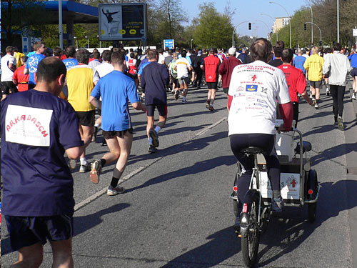 Entsprechend der Wohngegend ist die Zurückhaltung der Anwohner. Es ist etwas ruhiger hier, was mich nicht stört sondern mich staunend schauen lässt. Links sehe ich das „Landhaus Scherrer“, ein weit über Hamburg hinaus bekanntes Gourmet-Restaurant. Das Tagesmenü kostet hier ab 79,00 Euro. Kaum verlassen wir die vornehme Gegend, stehen die Menschen am Straßenrand wieder dichter. Wir kommen zu Kilometer 10, es gibt Wasser und Bananen.