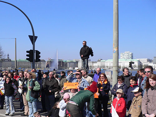Bei Kilometer 14 schau ich auf die Uhr: 1 Stunde und 21 Minuten sind rum. Ich glaub es nicht, wo ist die Zeit geblieben? Abwechslungsreich geht es auch weiter. Rechts der Hauptbahnhof, dann rein in den Tunnel. Ein paar Minuten, und wir sind wieder in der Sonne und inmitten der jubelnden Zuschauer. Wir laufen jetzt um die Binnenalster, zuerst auf dem Ballindamm, sehen vor uns das Rathaus und kommen dann auf den Jungfernstieg. Ich beneide die Hamburger um ihre schöne Stadt. Es ist einfach herrlich hier und wunderbar zu laufen. Ich sehe die teueren Uhren-, Schmuck- und Modegeschäfte und vornehmen Hotels.
