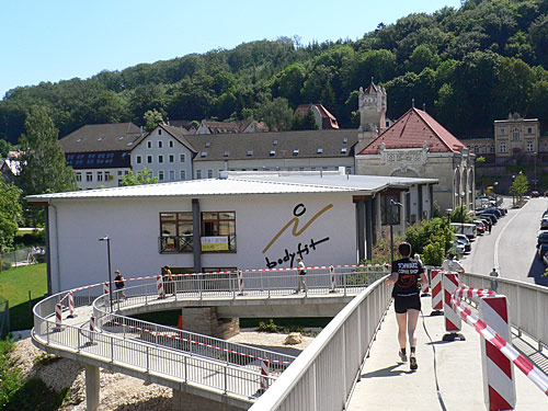 Das Gartenschaugelände (km 24) liegt hinter uns und wir kommen nach Schnaitheim, überqueren die Brenz über einen schmalen Holzsteg und laufen auf dem geteerten Radweg am Flussufer zurück. Wunderschön ist es hier. Ganz langsam nur fließt der Fluß dahin, fast meint man, man sei an einem Seeufer. Das ist typisch für die Brenz, die auf ihrer gesamten Länge von 55 Kilometern nur 70 m Gefälle hat. Sonnige und schattige Abschnitte wechseln sich ab. Es ist warm, aber immer noch im angenehmen Bereich. Es ist Leben auf der Strecke, denn die schnellen Marathonläufer überholen mich und die langsamen Halbmarathonläufer werden von mir überholt. Ich genieße den Lauf und die Landschaft und vergesse meine schmerzenden Beine.