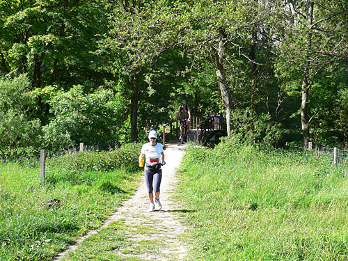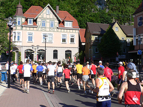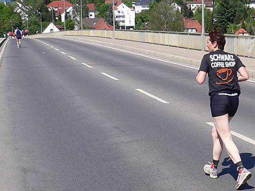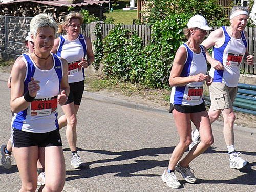 Einen Kilometer weiter hole ich den noch immer gut gelaunten Lauftreff Zang wieder ein, dem sich zwischenzeitlich Frank Fischer vom Lauftreff „Carl Zeiss“ angeschlossen hat. „Ute, langsam,“ mahnt Baldur, der sich vorgenommen hat, die Gruppe so lange wie möglich zusammen zu halten und möglichst geschlossen ins Ziel zu bringen.