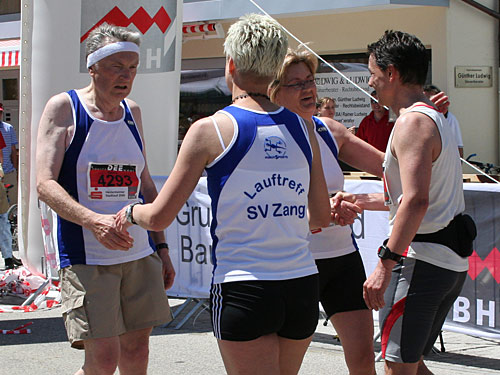 Zuvor, bei Kilometer 10, macht der Lauftreff des SV Zang durch lautes Rufen auf sich aufmerksam: „Mach von uns auch mal ein Bild, wir wollen auch in die Zeitung.“ Ich lasse mich nicht zweimal bitten und speichere das gut gelaunte Damenquartett (Ute, Anja, Angelika und Renate) mit ihrem Leitwolf Baldur auf den Chip. Dann sind sie weg.