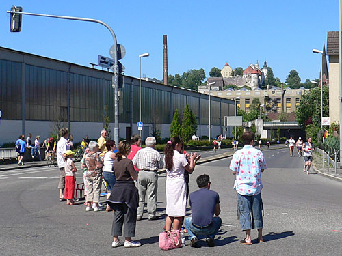 Gleich geht es über eine schmale Fußgängerbrücke wieder zurück auf die andere Seite und zunächst in die Kanal- und dann in die Theodor-Heuss-Straße zu einer kleinen Schleife durch die Oststadt (km28). Dieser Streckenabschnitt ist nicht gerade attraktiv und manche beklagen die wenigen Zuschauer. Der herrliche Blick auf das Schloss auf dem Rückweg sollte Entschädigung genug sein.
