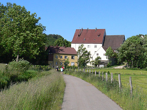 Wir laufen in südliche Richtung stadtauswärts und kommen an den erwähnten Firmen Voith und Hartmann vorbei, laufen rechts, links und wieder rechts, sind auf der Oberdorfstraße und bei der Wangenmühle haben wir das Flüsschen Brenz erreicht, dem wir jetzt entlang laufen. Meist geht es ziemlich eben und im Schatten am Waldrand entlang, manchmal auch in der Sonne über saftig grüne Wiesen.
